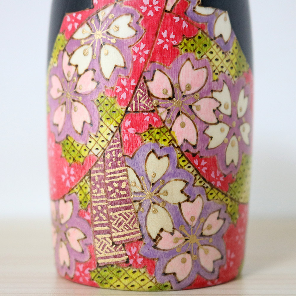 Creative Kokeshi doll by Fumio Tomidokoro (1948-) titled 花明り (Hana Akari) which means “The brilliance of cherry blossoms which illuminate the evening”. Her kimono is beautifully decorated with cherry flowers in white and pink on a purple and dark pink background.