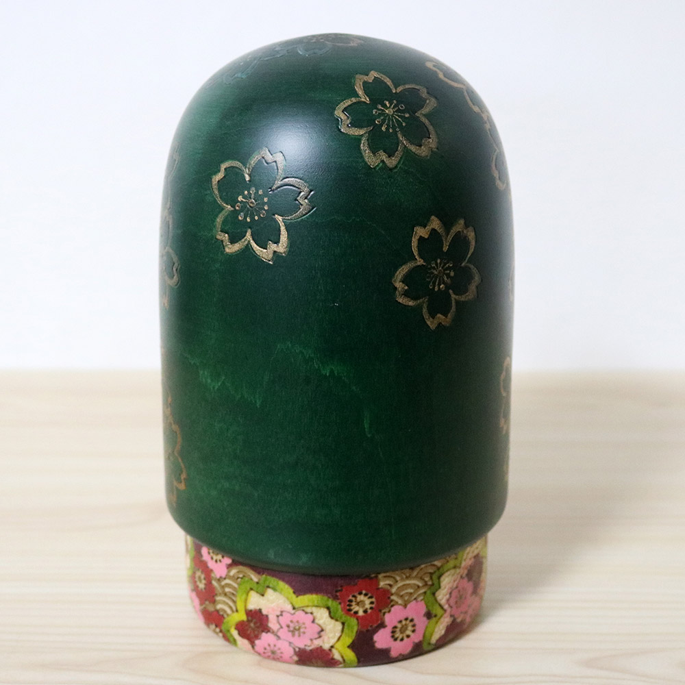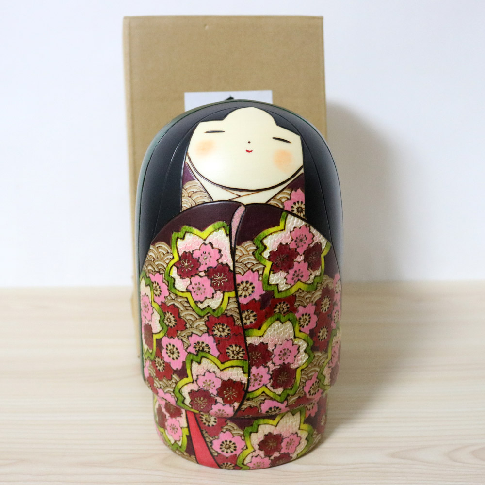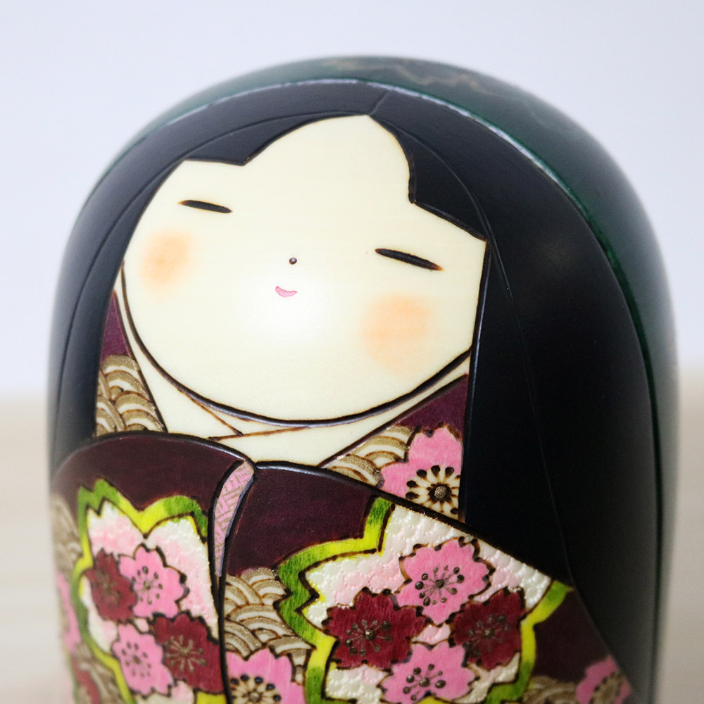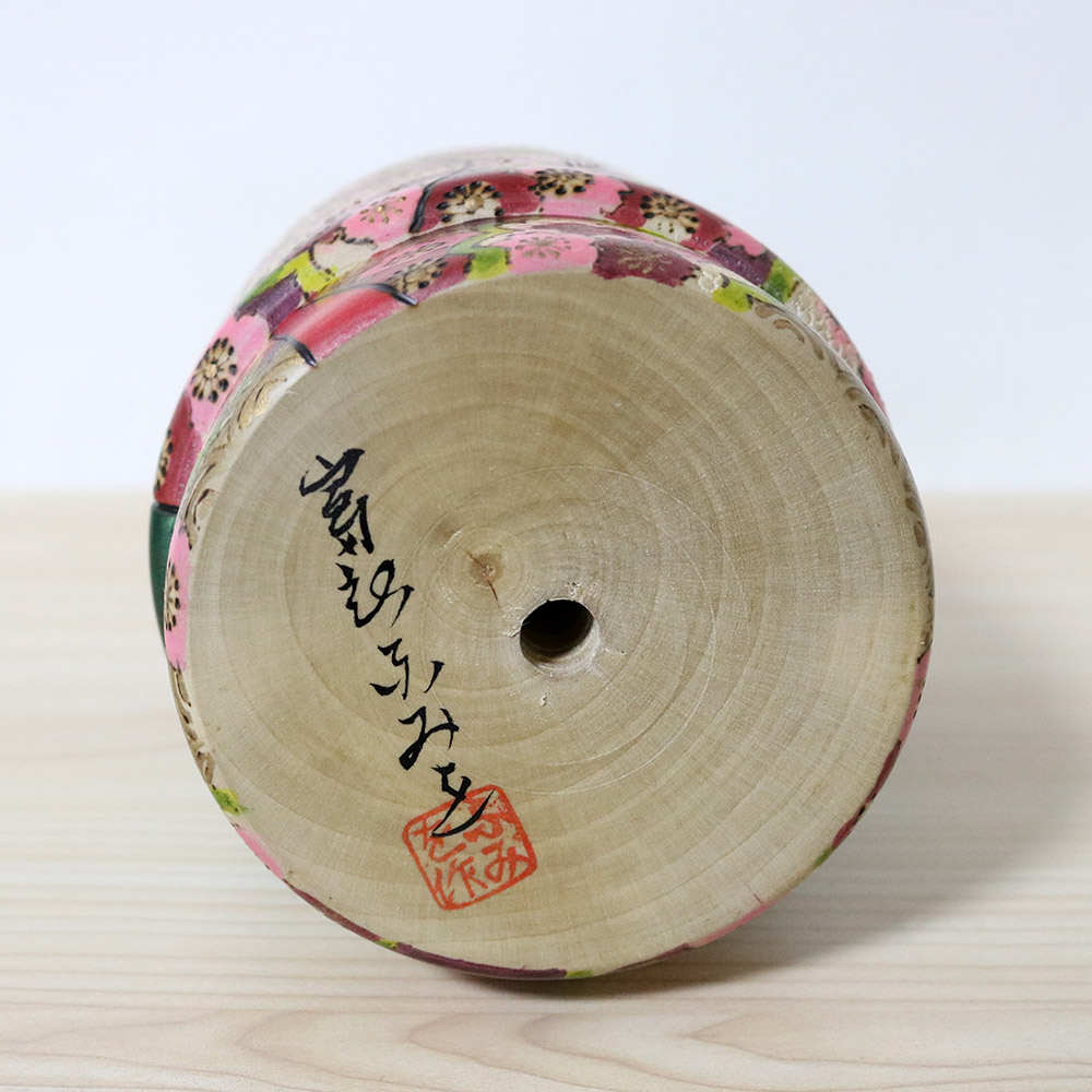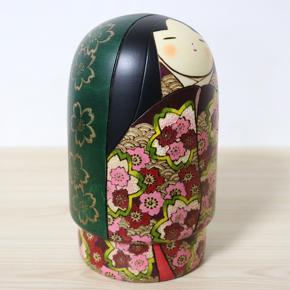 This wonderful and colorful kokeshi doll was made and signed by Tomidokoro Fumio. Her title is 春爛漫 (Haruranman) which means “Spring in Full Bloom”. Her kimono is meticulously carved and painted with sakura (cherry) blossom flowers in shades of pink, white, red and dark red. In addition, she’s wearing a dark green veil with golden sakura flower decorations and has an innocent and soft face which is something that Tomidokoro san excels at.