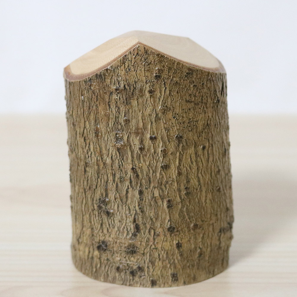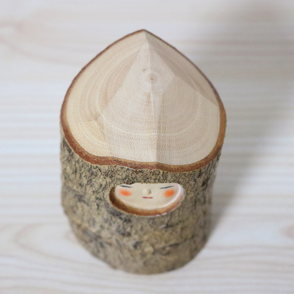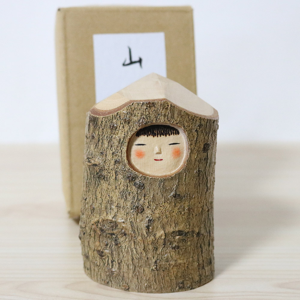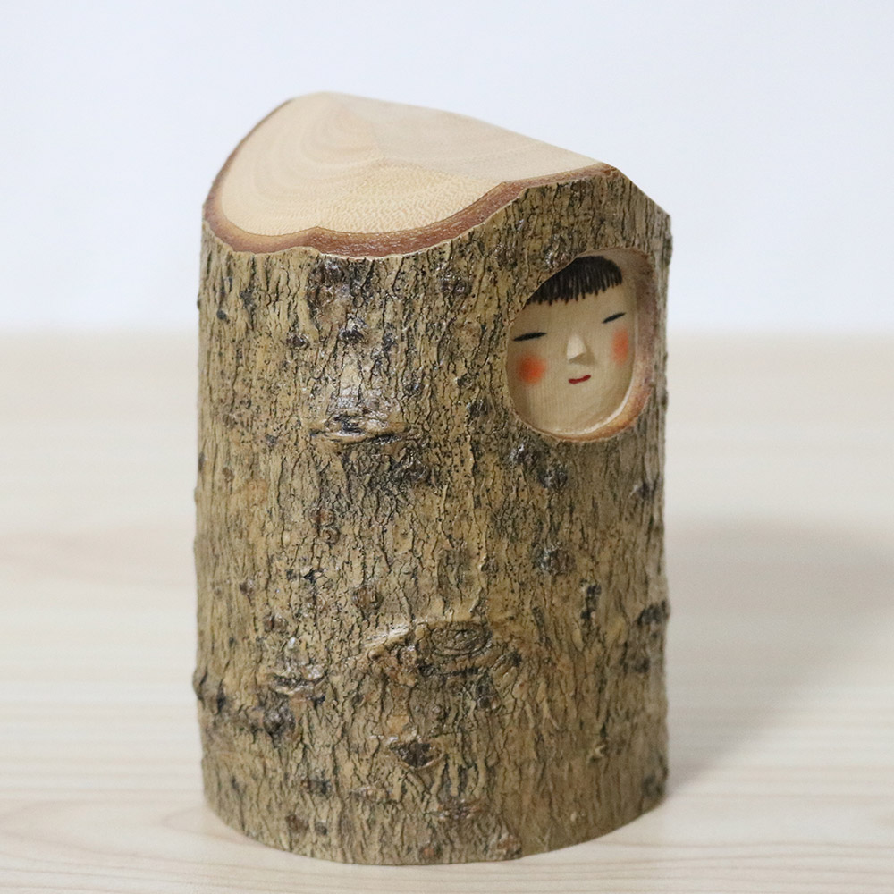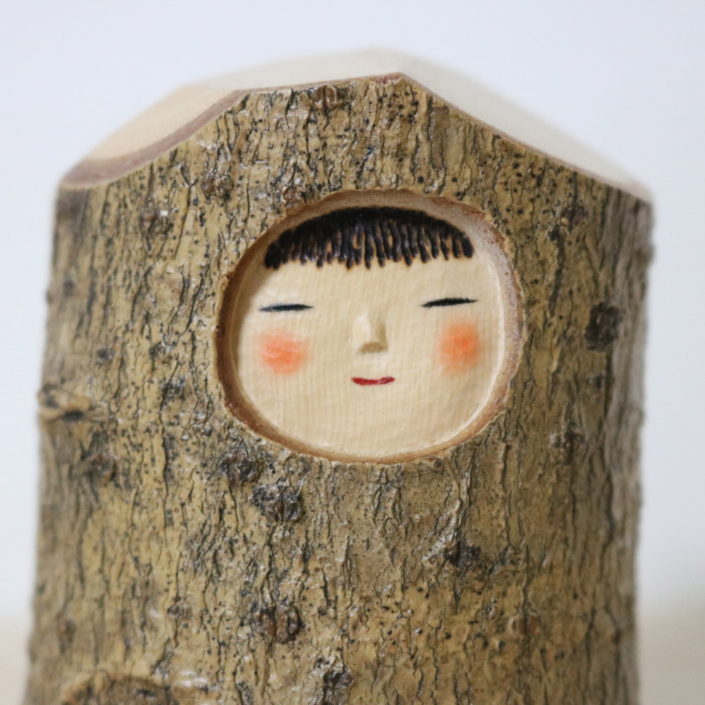 This kokeshi doll was made & signed by Fumio Tomidokoro (1948-). He’s titled 山童 (Yama Warabe) which means “Mountain Child”. Tomidokoro san made beautiful use of a rather thin piece of wood and created an adorable kokeshi hiding in the bark. The top of the doll is smooth and cut in several angles while the original bark is rugged to the touch.