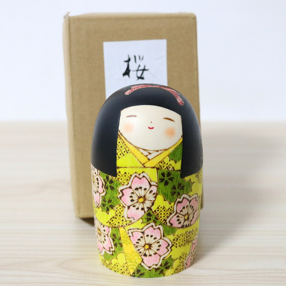 Made of mizuki (dogwood) wood she’s wearing a kimono in shades of yello and green with pink cherry blossom flowers. She also has a small cute pink ribbon on her head.