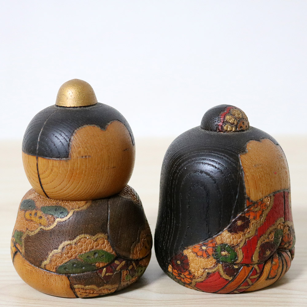 This vintage hina Kokeshi doll set was made by Fumio Tomidokoro (1948-). The male is wearing a brown kimono with pine tree decorations while the female’s red kimono is decorated with chrysanthemums.