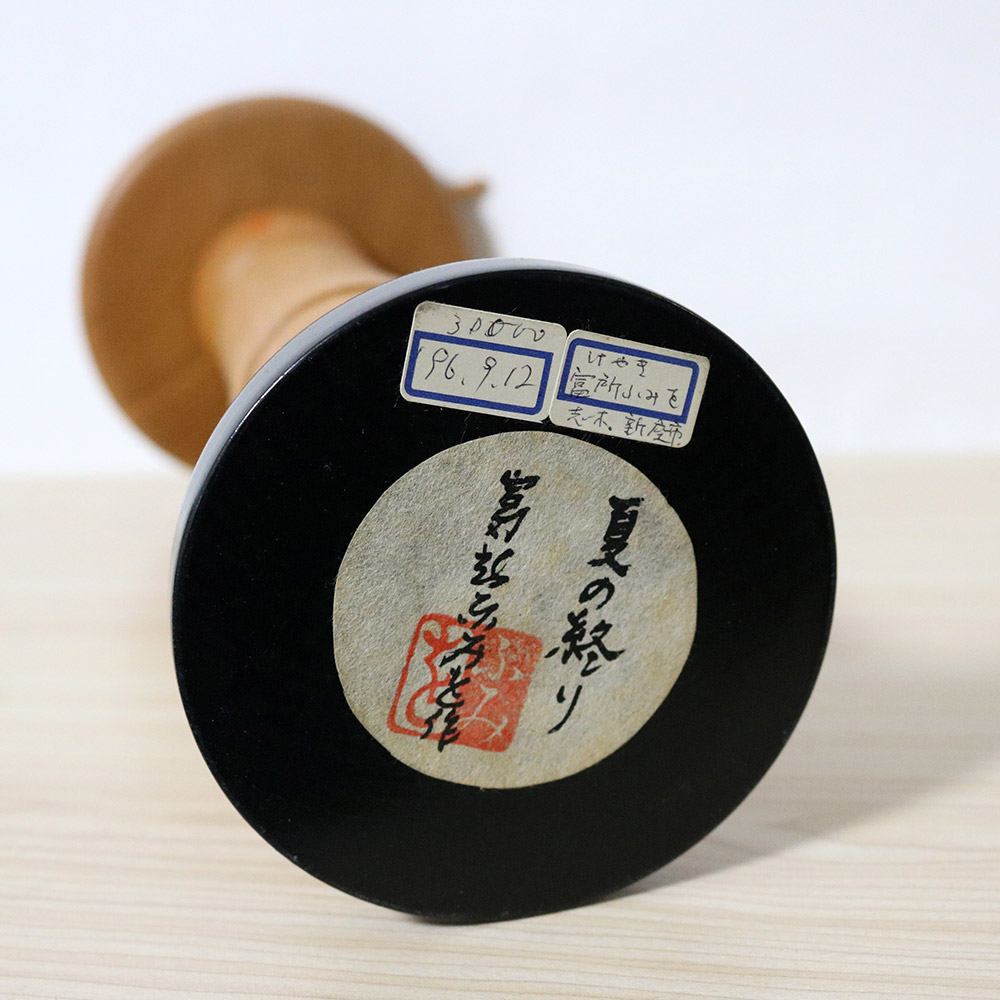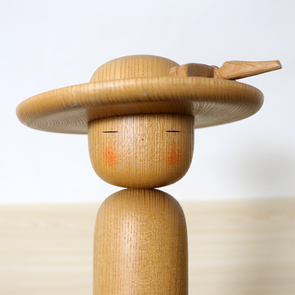 This beautiful kokeshi doll was made & signed by Fumio Tomidokoro (1948-). She’s titled 夏の終り (Natsu no Owari) which means “The End of Summer”. Made of warm toned keyaki (zelkova) wood she’s wearing a hat with a dragonfly gently sitting on it. In Japan, dragonflies symbolize the transition from summer to autumn, they are often used in Haiku (Japanese poetry) for this reason.