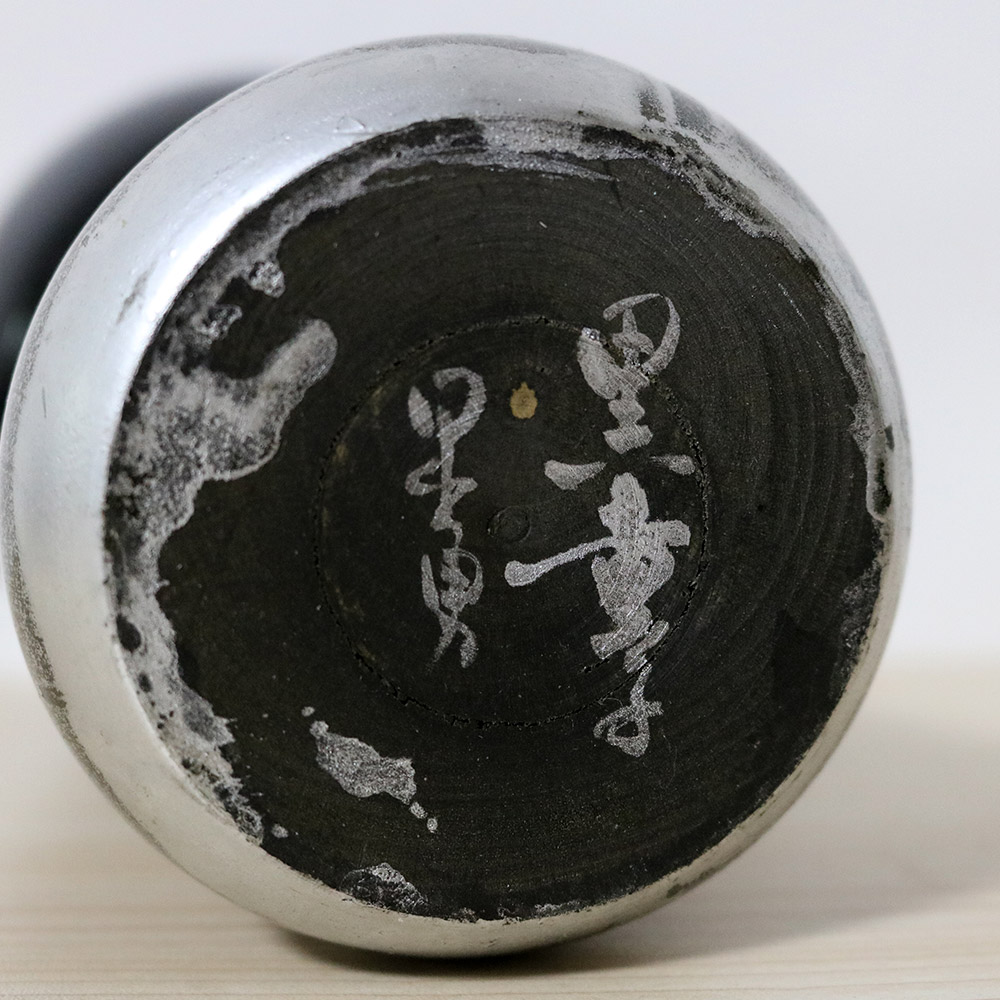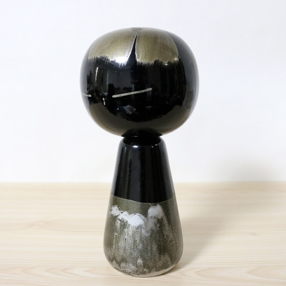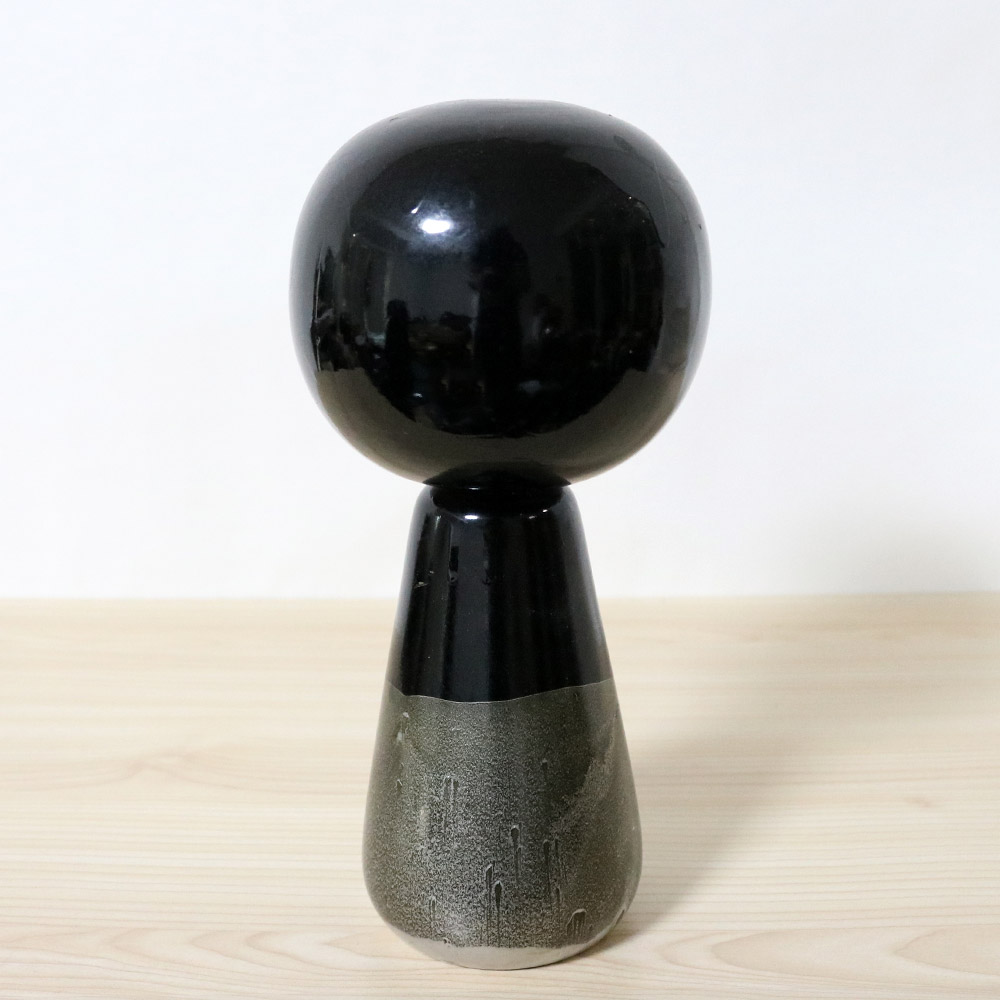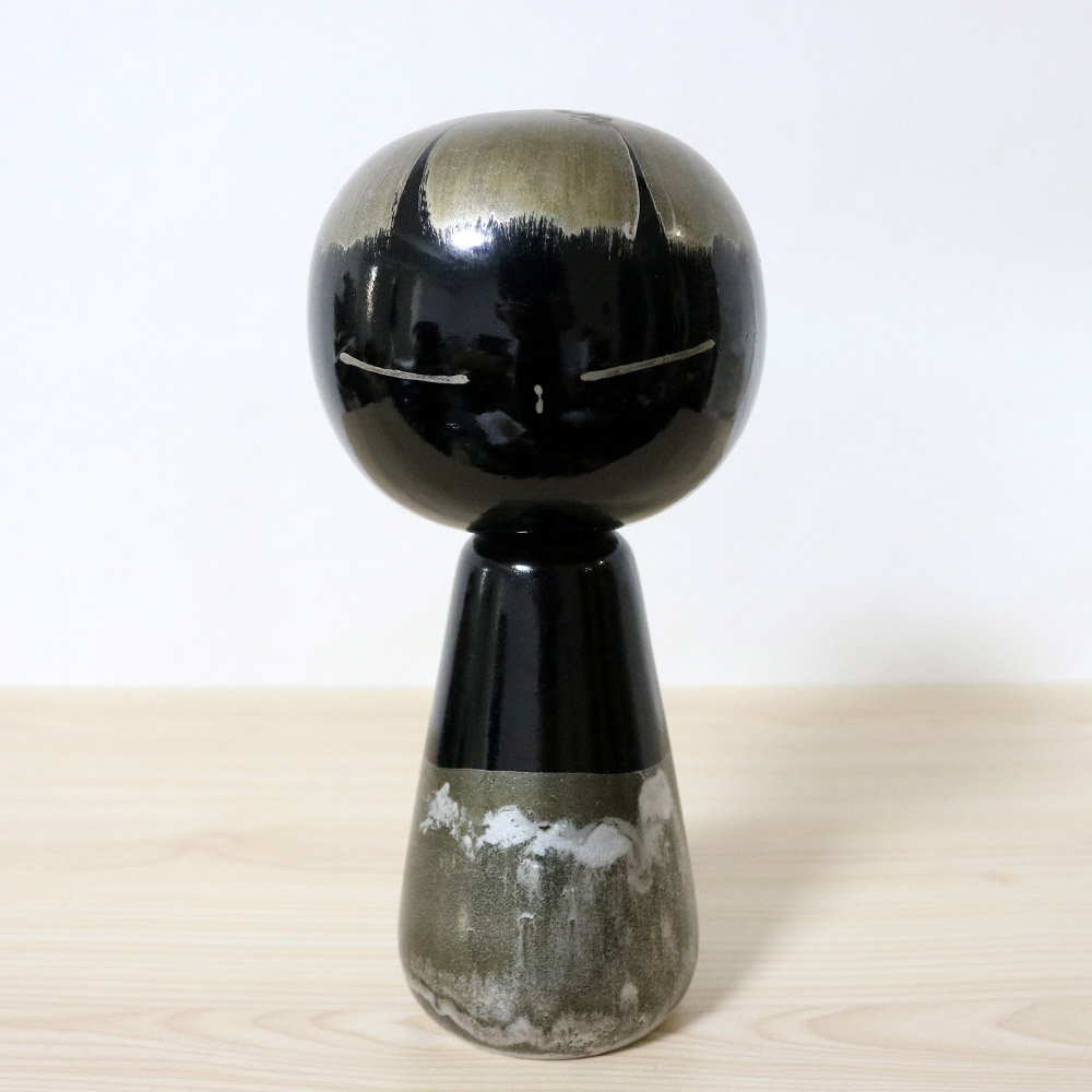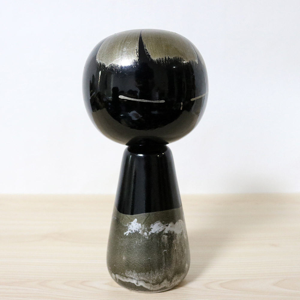This vintage creative kokeshi doll was made and signed by the award winning master Hideo Ishihara (1929-1999). Her title is 黒童子 (Kurodoji) which means “Dark Child”. She’s painted in black with a glossy finish and has silver hair, eyes and abstract decoration along her bottom half.
