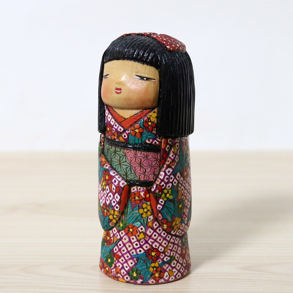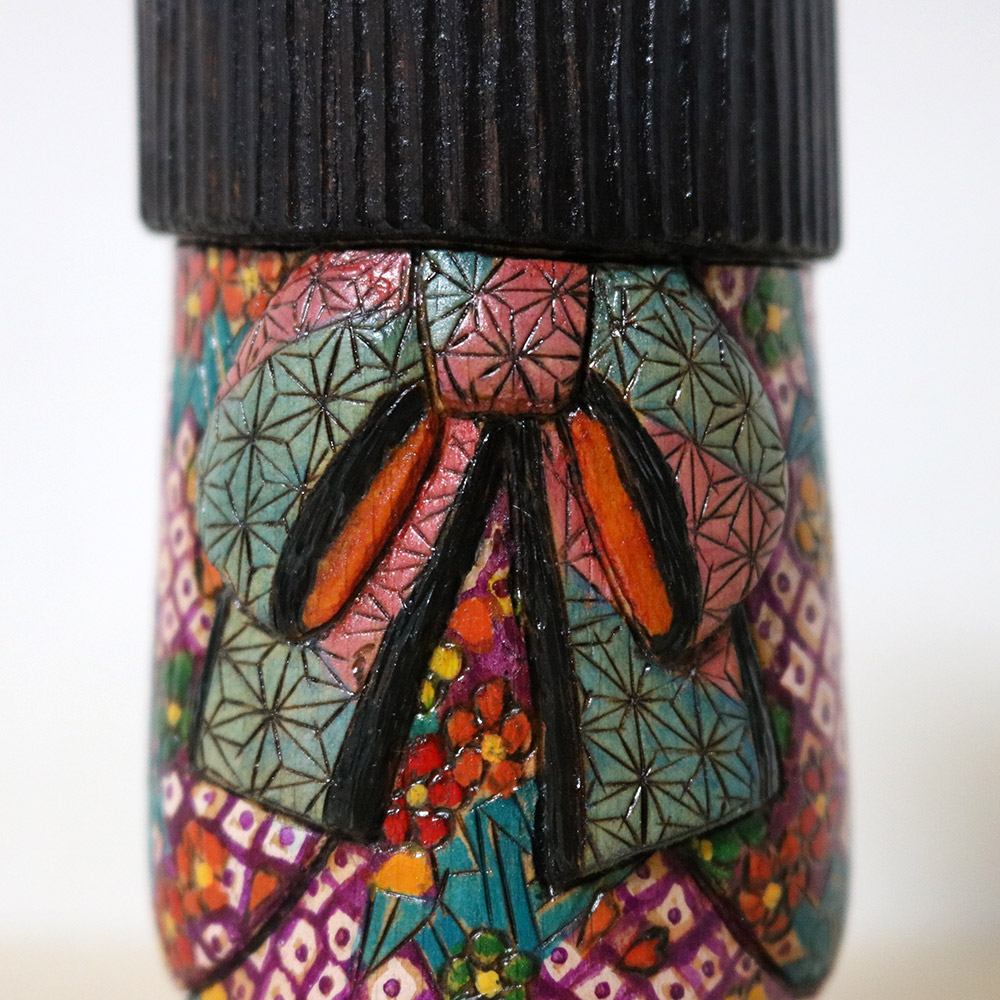 This creative kokeshi doll was made and signed by Ichiko Yahagi (1952-). Her title is 千鶴 (Chizuru) which is both a girl’s name and also means “One Thousand Cranes”. In Japanese culture, Cranes symbolize longevity and peace. There’s a tradition that by folding 1000 paper origami cranes a wish will come true. Her stunning kimono features origami cranes in dark turquoise, flowers in orange, yellow and red, as well as a kanoko dotted pattern. Her stunning obi is carved with an asanoha pattern.