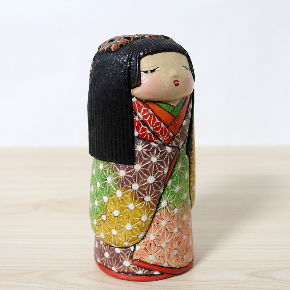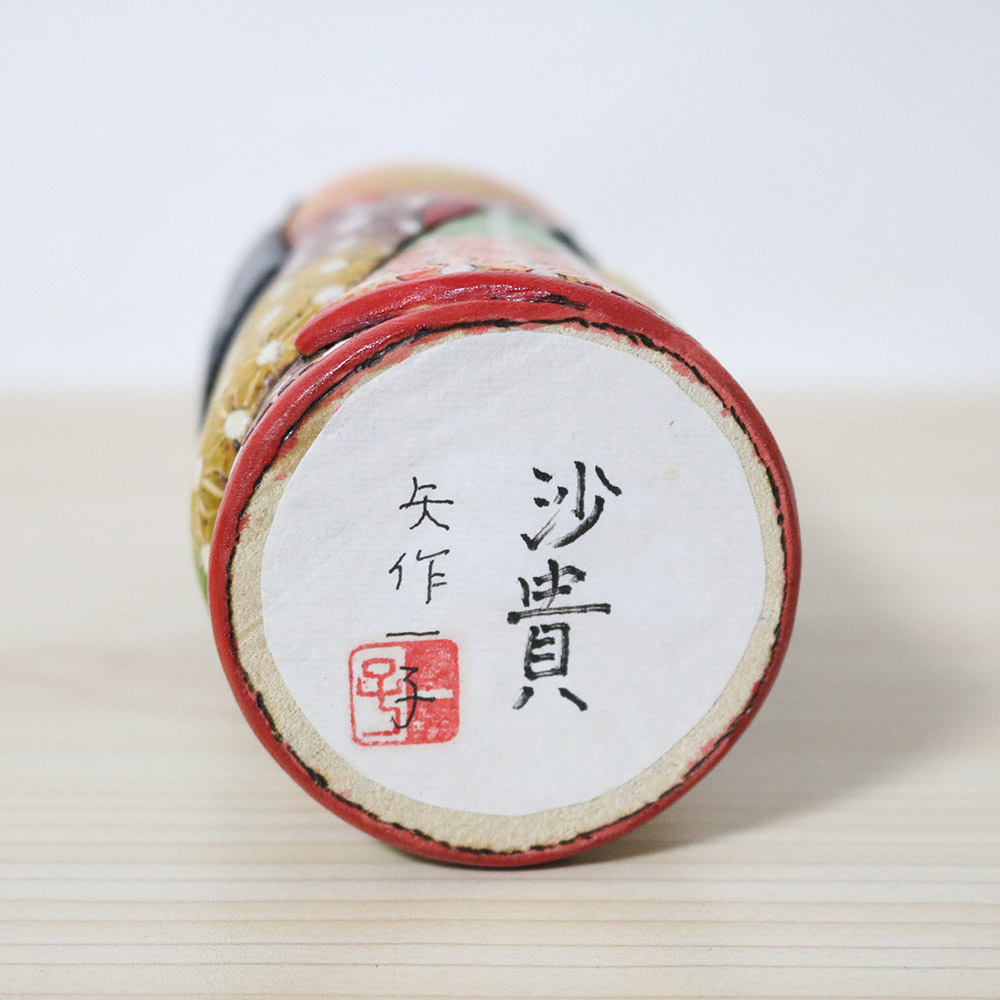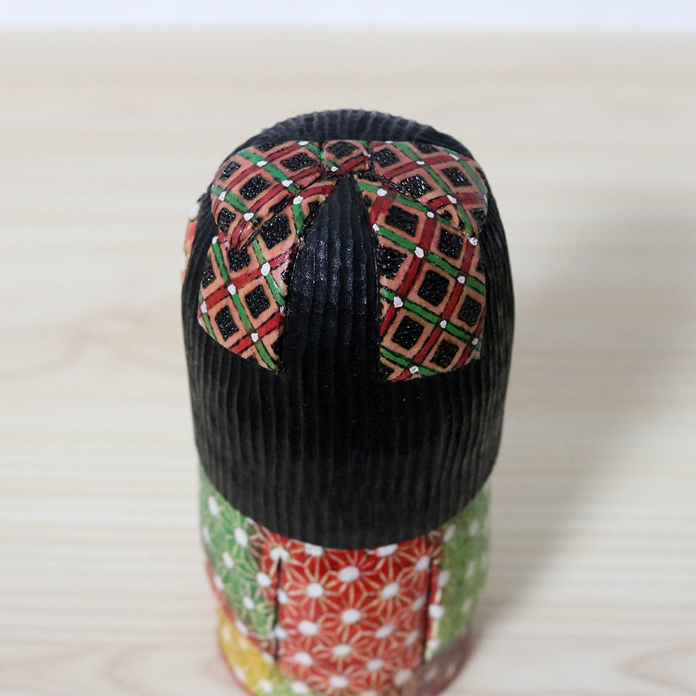 This creative kokeshi doll was made and signed by Ichiko Yahagi (1952-). Her title is 沙貴 (Saki) which is a girl’s name. She’s wearing a fabulous kimono with a repeating auspicious asanoha (hemp) pattern in various colors. Her hair has an adorable ribbon in pink, blank, red, green and white. She’s standing in a lovely pose with one hand raised, a post that resembles traditional Japanese dancing.