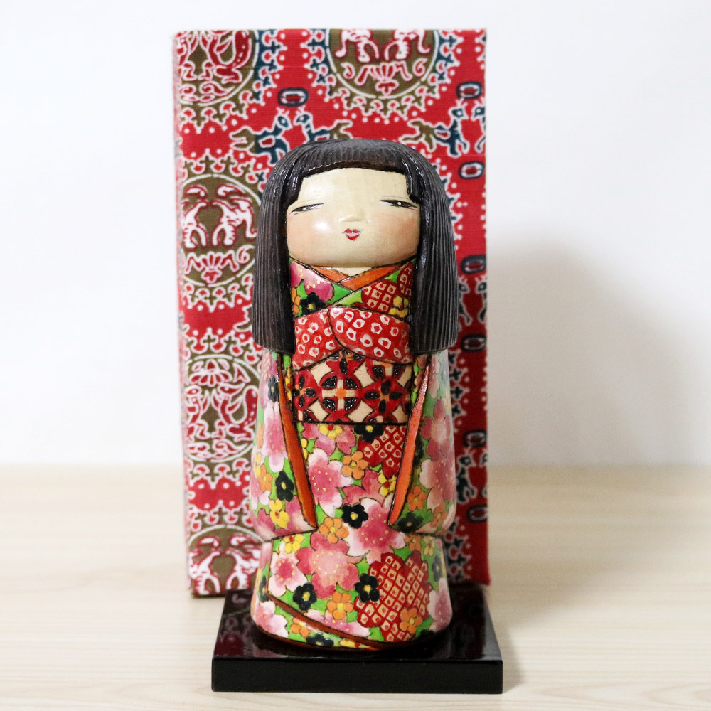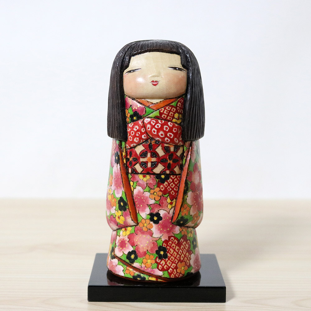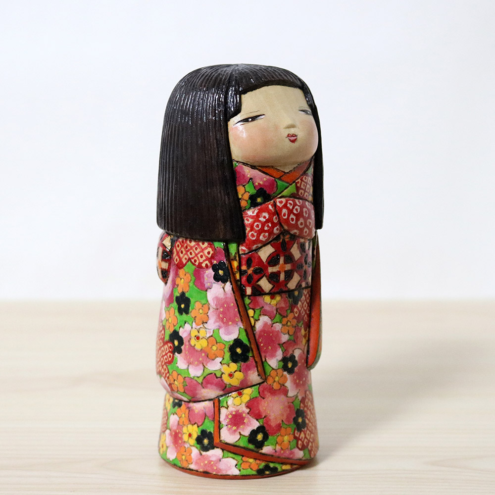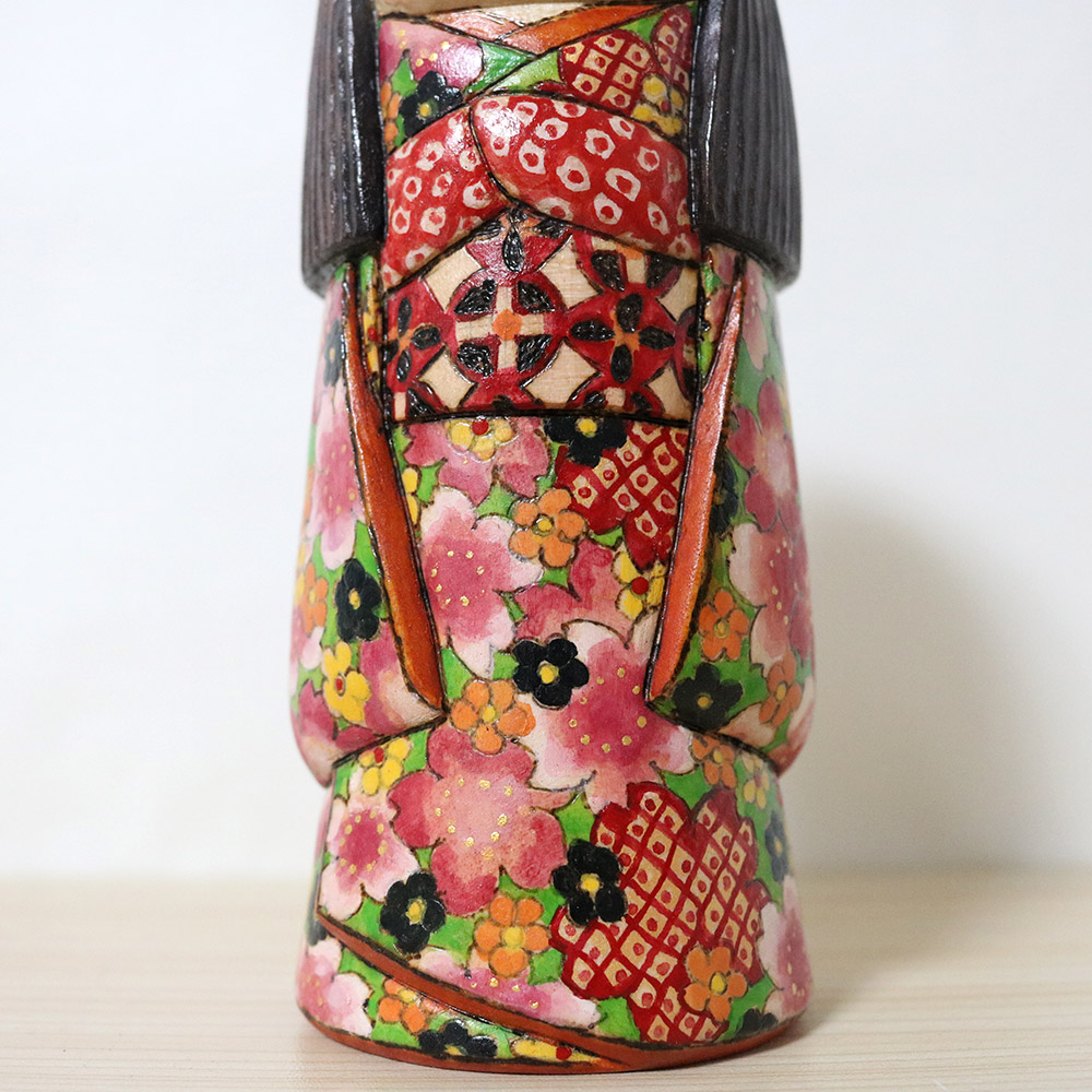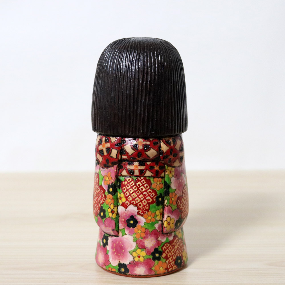 This creative kokeshi doll was made and signed by Ichiko Yahagi (1952-). Her title is 咲希 (Saki) which is a play of words since it’s both a girl’s name and can mean “Hope that Blossoms”. Her kimono is blossoming with plenty of flowers in red, black, orange, yellow, and various sakura flowers in shades of pink.