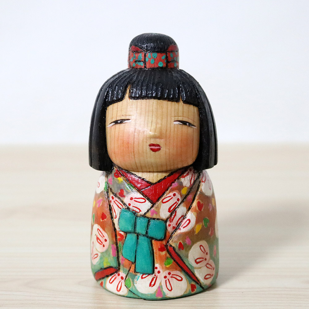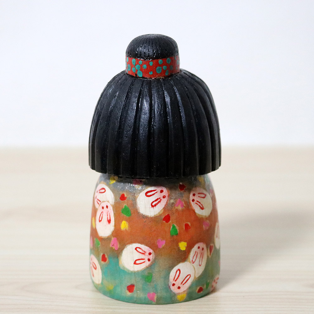 This creative kokeshi doll was made and signed by Ichiko Yahagi (1952-). Her title is 卯月 (Uzuki) which is another name for the 4th month of the lunar calendar. It correlates more or less to April and it’s related to spring blossoming of flowers, especially deutzia flowers. 卯 can also mean rabbit hence her kimono is decorates with colorful flowers and white rabbits. Her hair is beautifully carved in different widths and also has a lovely red ribbon around her hair bun.