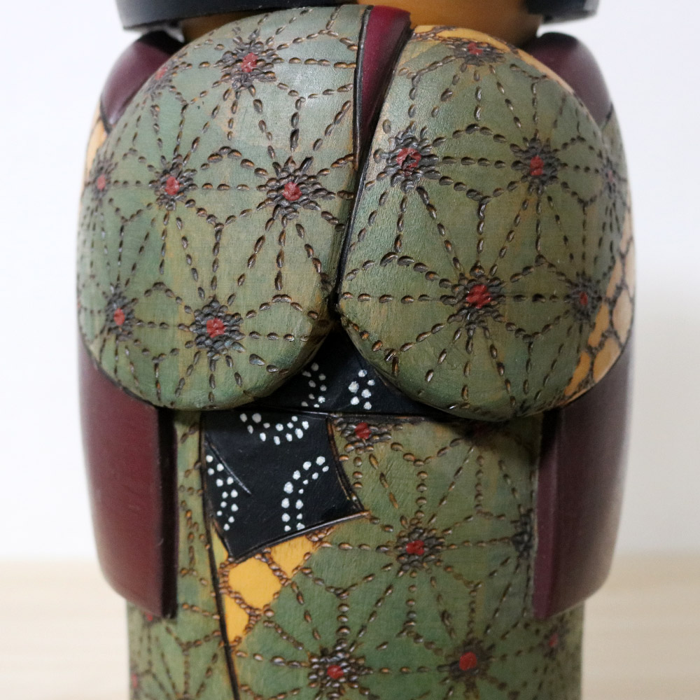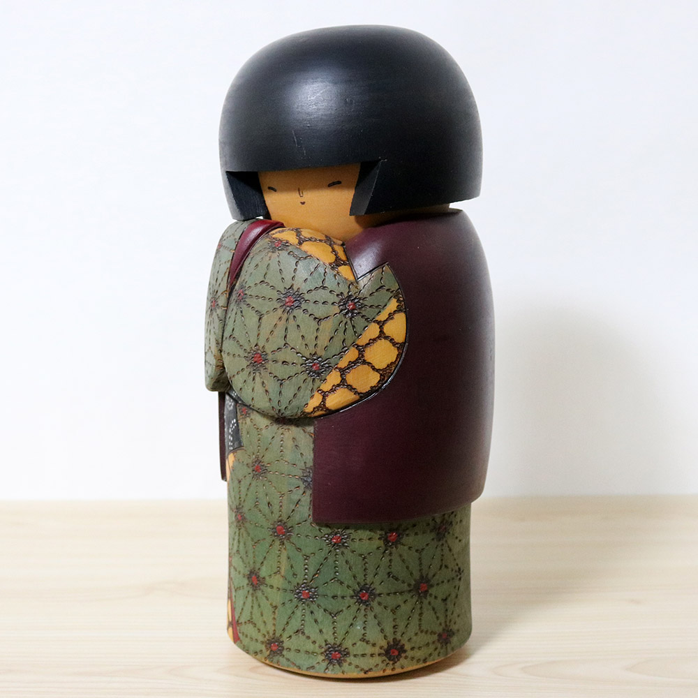 He was born in 1931 in Gunma prefecture and won multiple awards for his kokeshi dolls throughout his life, including winning the prestigious Prime Minister award in 1979. His dolls are usually tall and elegant featuring natural wood colors combined colorful kimonos.