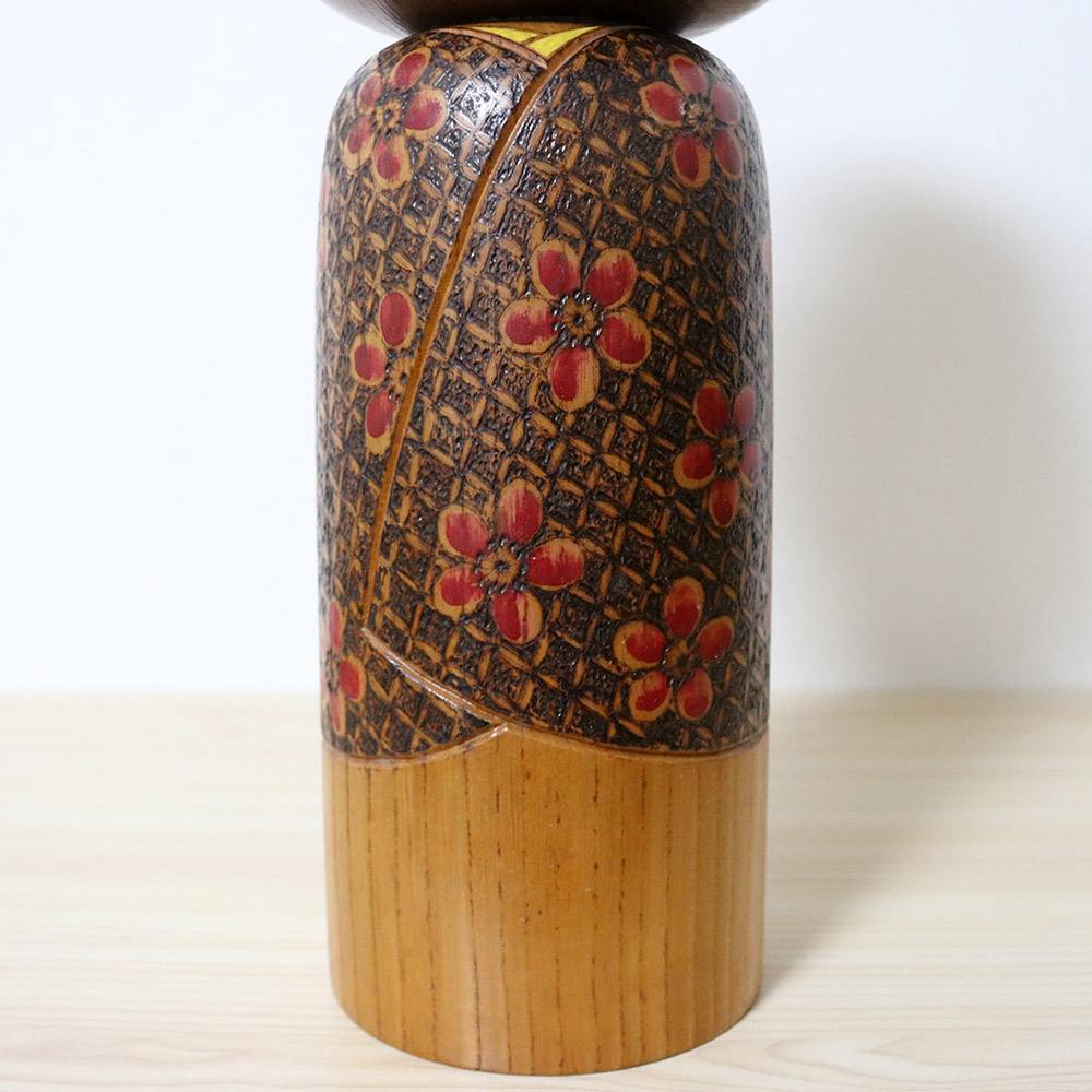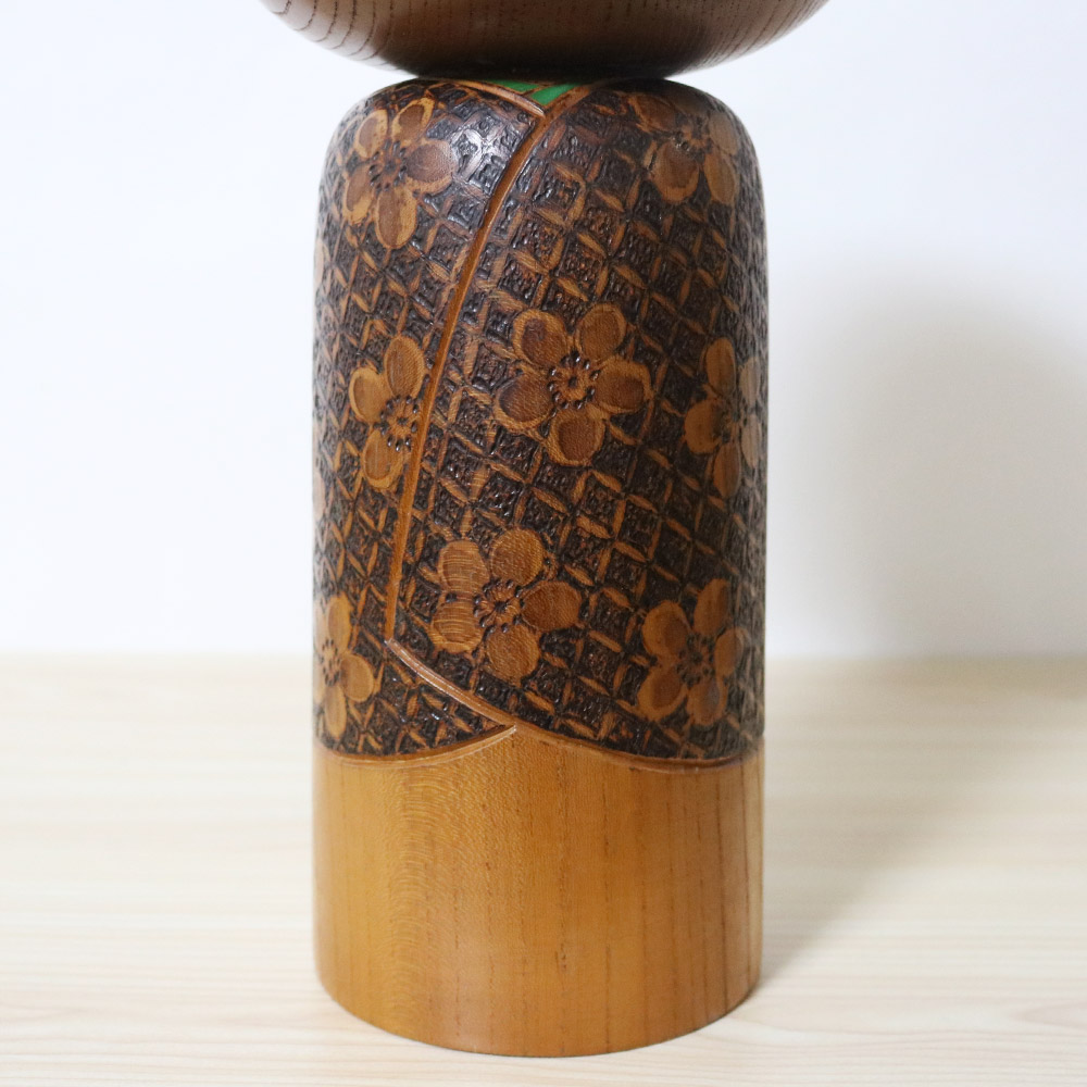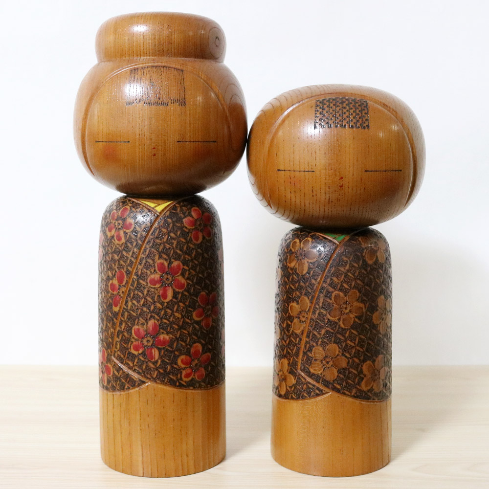 They are titled 想 (Omoi) which means “Thoughts” (can also mean “Feelings”). Made of beautiful keyaki with a golden hue, they feature kimonos made by burning the wood in a square pattern around flowers carved on the dolls. The tall one has a hint of yellow in her kimono collar while the right one has a green kimono collar.