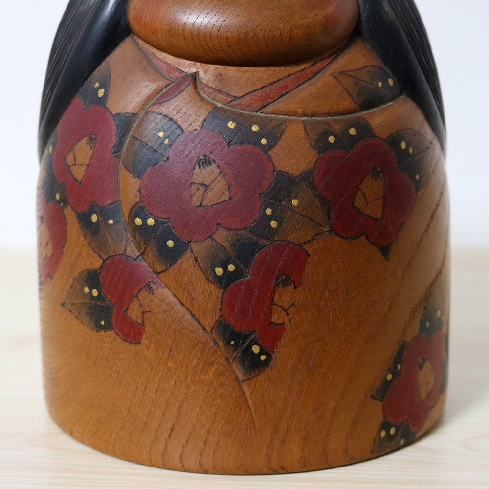 This vintage kokeshi doll was made and signed Kato Tatsuo (1940~) back in 1985. Her title is 山椿 which means “Mountain Camellia” and refers to camellia that grows in the wild. She’s made of zelkova wood that has darkened over the years and her kimono is decorated with beautiful camellia flowers with snowflakes on their leaves. Her hair is beautifully carved all the way down.