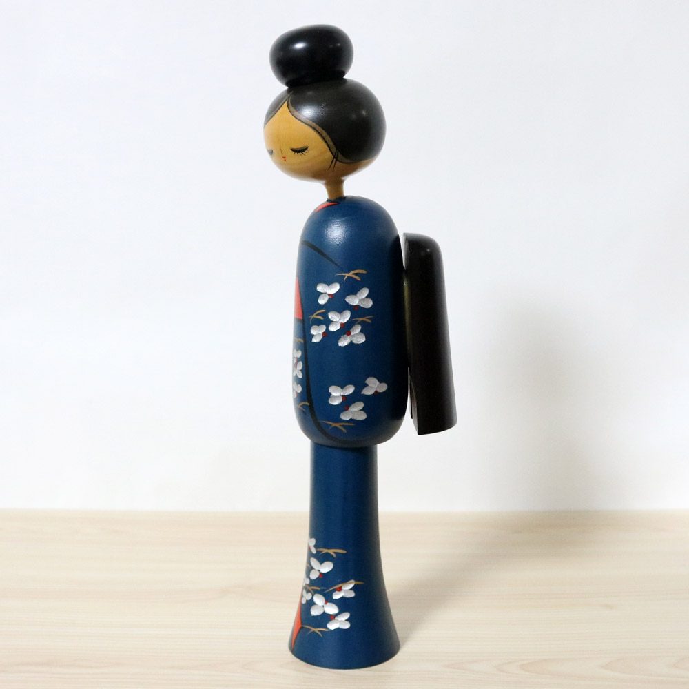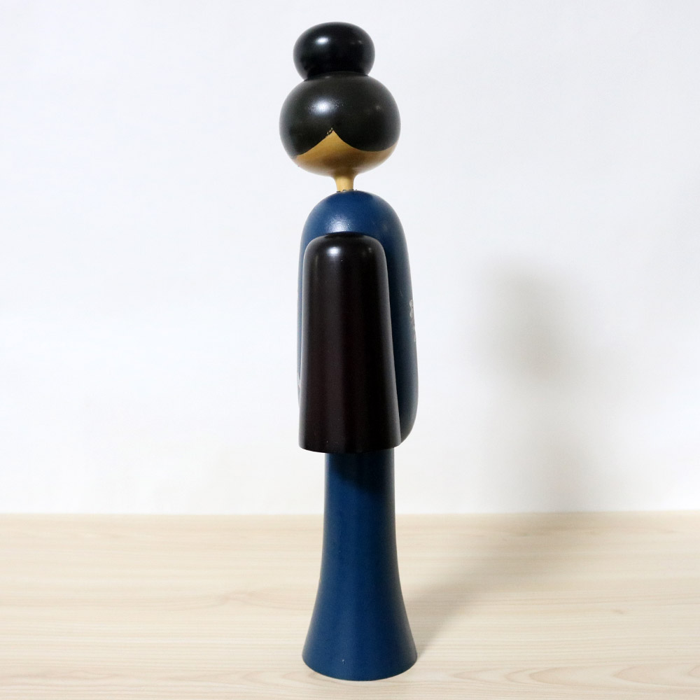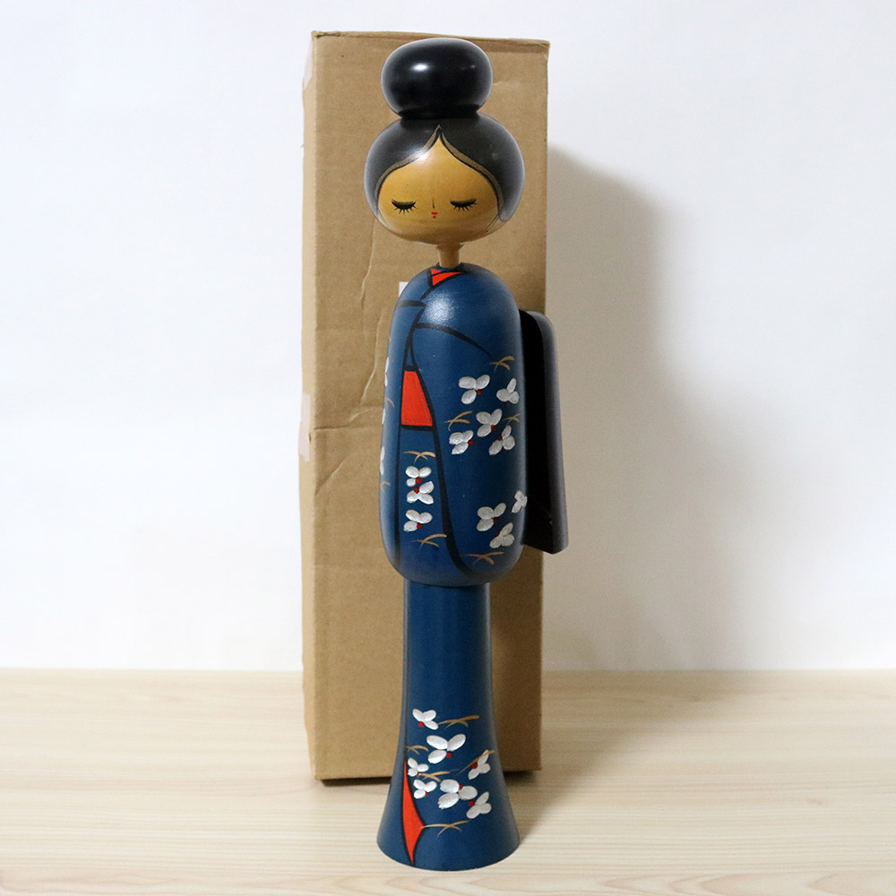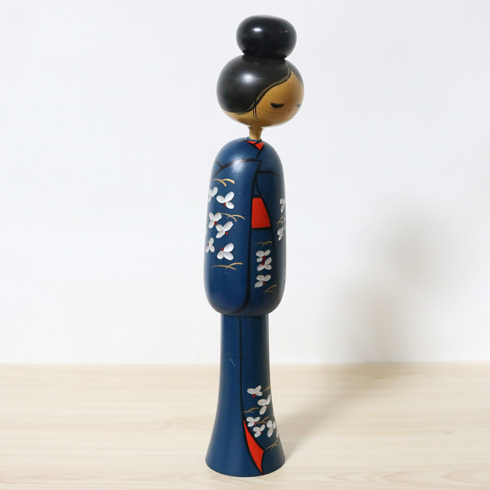 This tall vintage creative kokeshi doll was made by master Miyashita Hajime (1940-). Her title is 古都の夢 (Koto no Yume) which means “Dream of the Old Capital” which is a nostalgic reference to Kyoto or Nara (Japan’s old capitals). She’s wearing a blue kimono with white flower decorations, a red obi on the front which is also shown on the back in black.