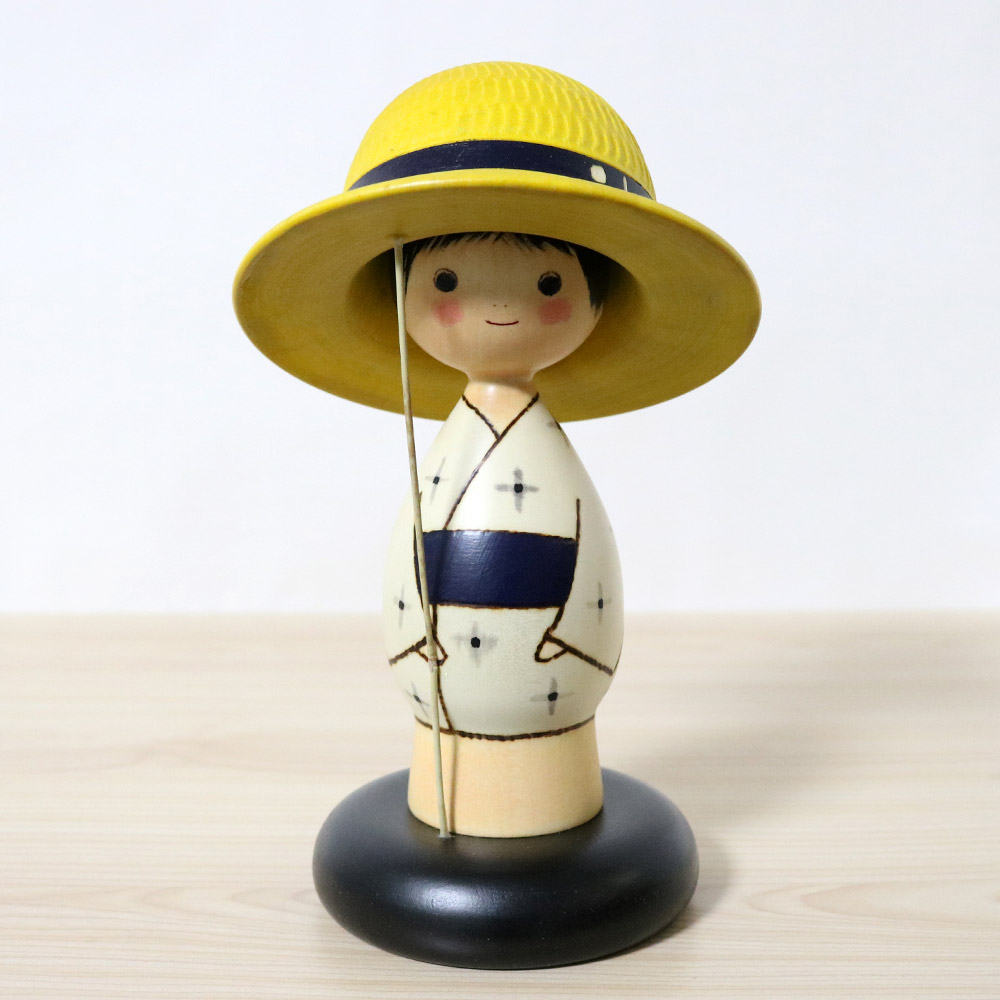 Kokeshi doll vintage creative by master Sekiguchi Sansaku (1925-2018). His title is “Semi no koe” (蝉の声) which means “Chirping of Cicadas”. He’s wearing a simple yukata (summer kimono) with blue decorations and a blue obi (kimono belt) as well as a matching hat with a blue ribbon. He’s carrying a long stick/net used for catching cicadas. Catching cicadas is a common summer pastime for kids in Japan.