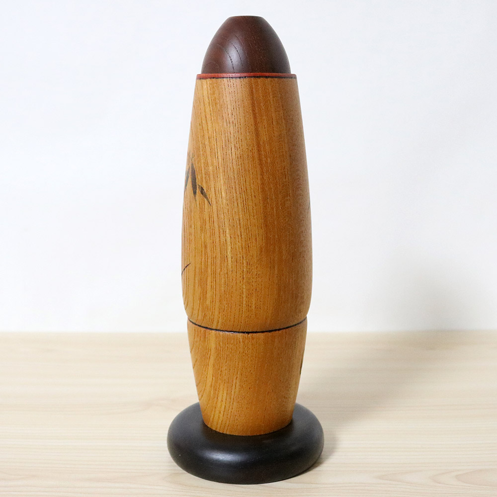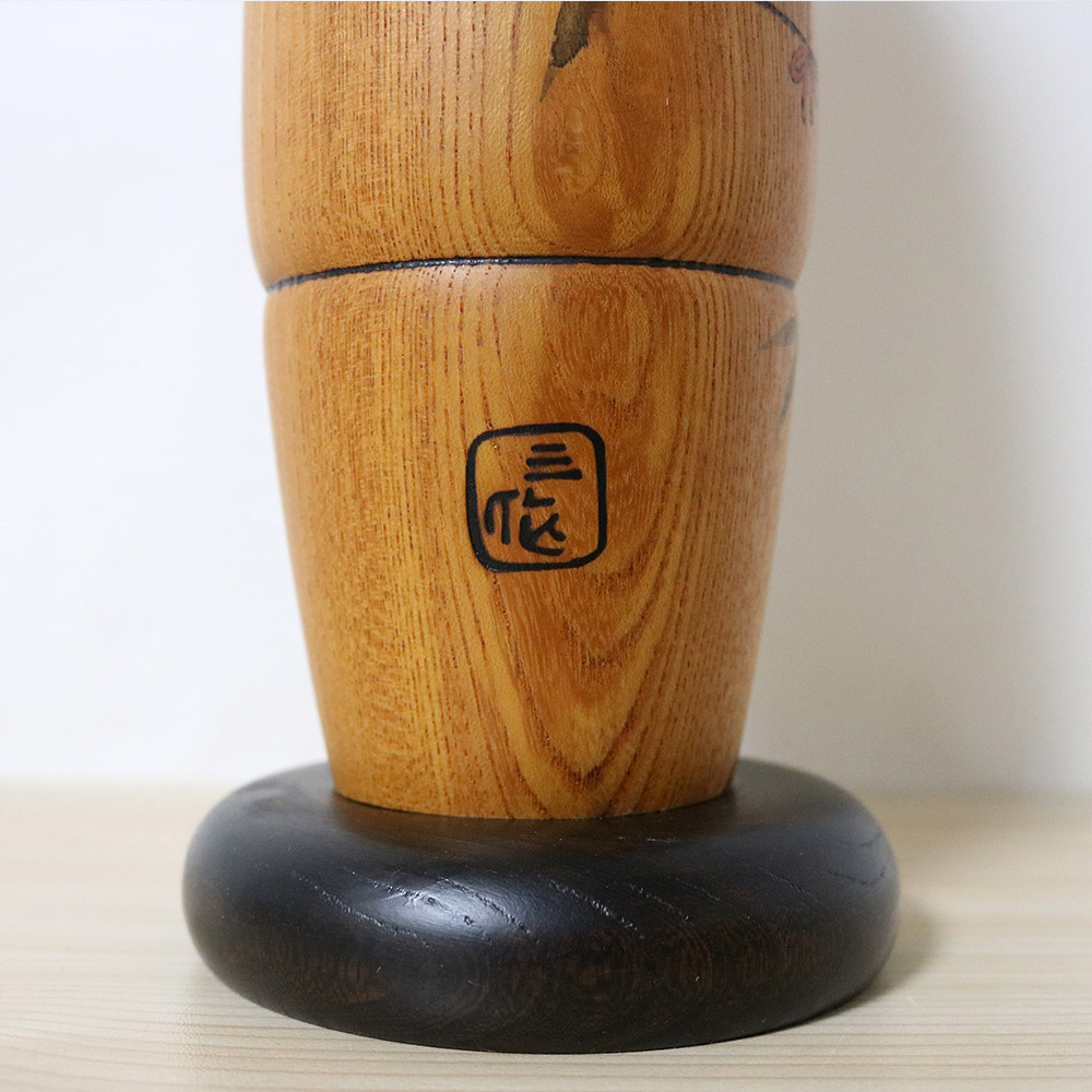 This vintage kokeshi doll was made and signed by master Sekiguchi Sansaku (1925-2018). Her title is 吟 (Gin) which means “Recitation of a Poem”. This is the keyaki version of the doll, the regular one is made of dogwood. She’s holding a lovely golden paper fan in her hand and her kimono has bamboo flower decorations.