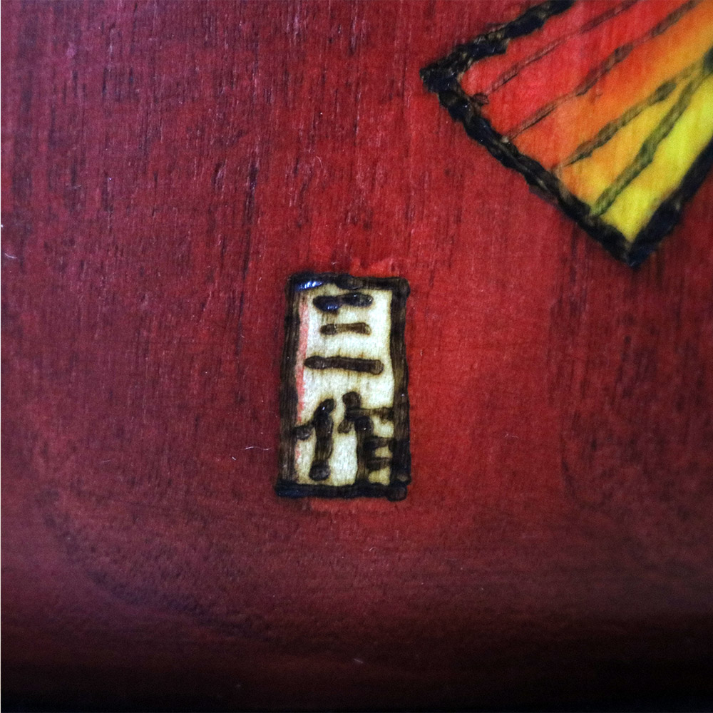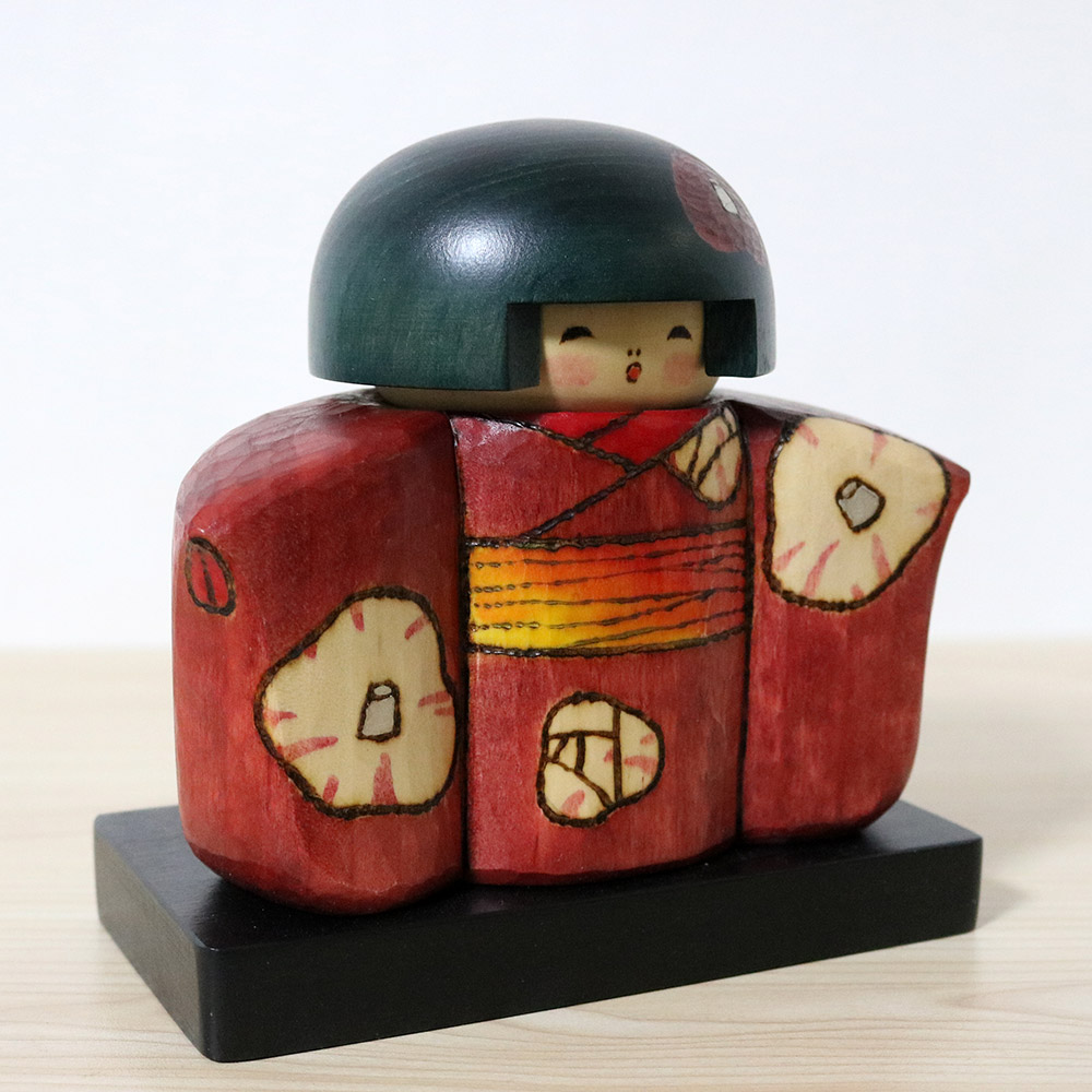 This pretty kokeshi doll was made and signed by master Sekiguchi Sansaku (1925-2018). Her title is 山茶花 (Sazanka) which means Sasanqua – a broadleaf evergreen shrub or small tree native to southern Japan. It’s known for its glossy, dark green foliage and beautiful, fragrant flowers that bloom from late fall to mid-winter. She’s wearing a long-sleeve kimono with Sasanqua flowers carved into it and a cute red & yellow obi in the middle. Her hair is also decorated with the same flower.