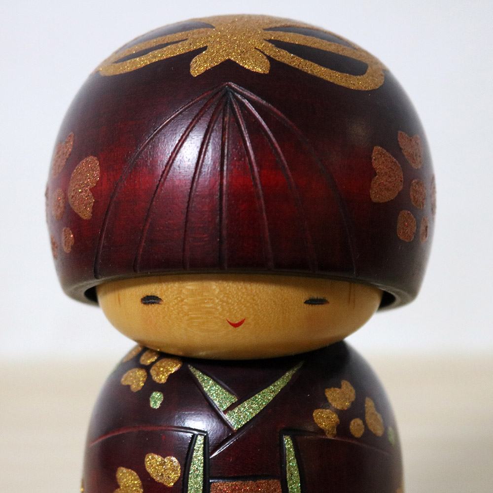 This bulky vintage creative kokeshi doll was made and signed by master Sekiguchi Toa (1942-). She’s titled 花乙女 (Hana Otome) which means “Flower Girl”. Her hair is decorated with a cute golden ribbon and simple, abstract flowers in pink. Her kimono is decorated similarly in golden flowers with green leaves. Toshio san gave her an extremely cute face with a wide smile.