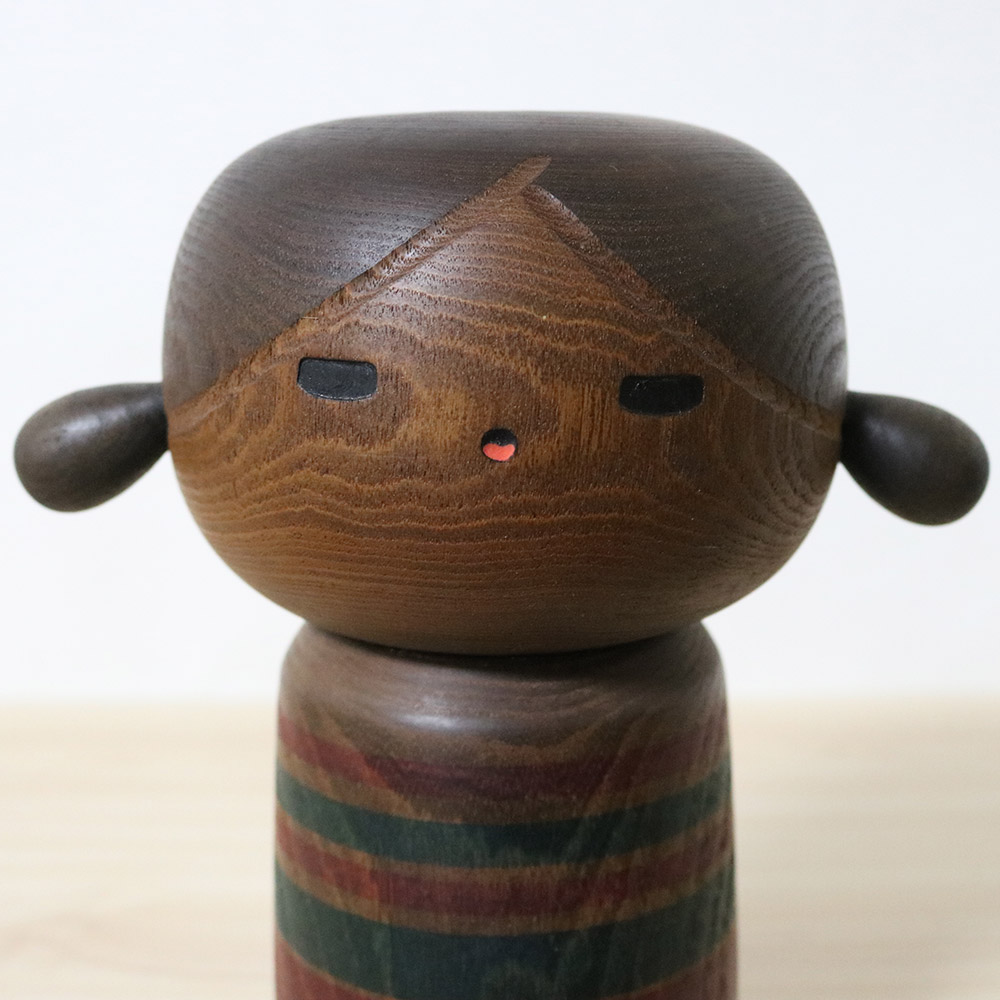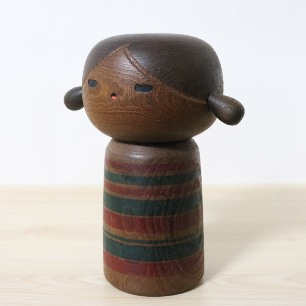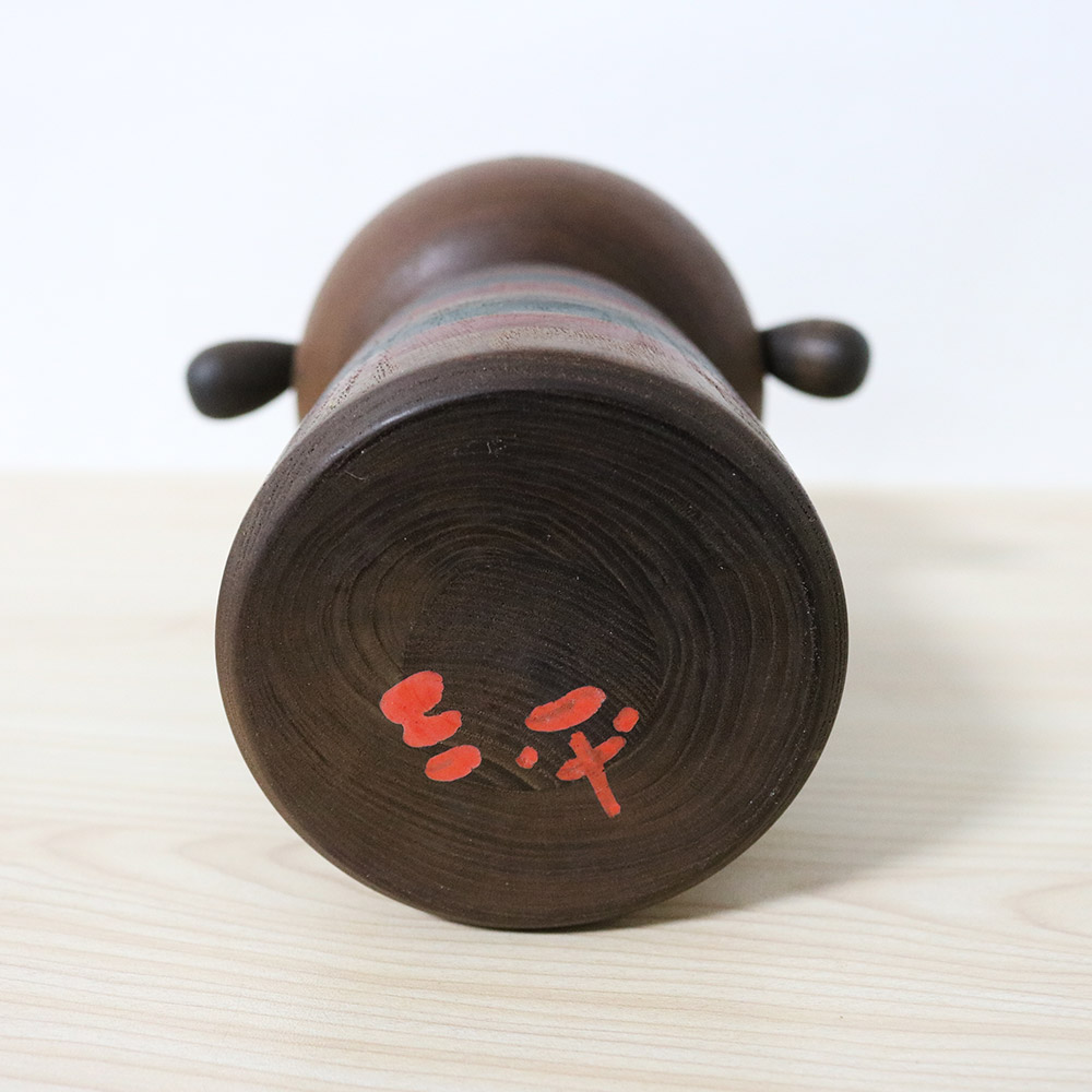 This kokeshi doll was made and signed by master Yamanaka Sanpei (1926-2012) who won over 20 awards for his kokeshi dolls including the prestigious “Prime Minister Award” in 1979. Sanpei’s inspiration for kokeshi doll designs often come from children. Her title is 里の子 (Satonoko) which means “Village Girl”. She has a cute set of pigtails and a child-like eyes gazing in wonder.