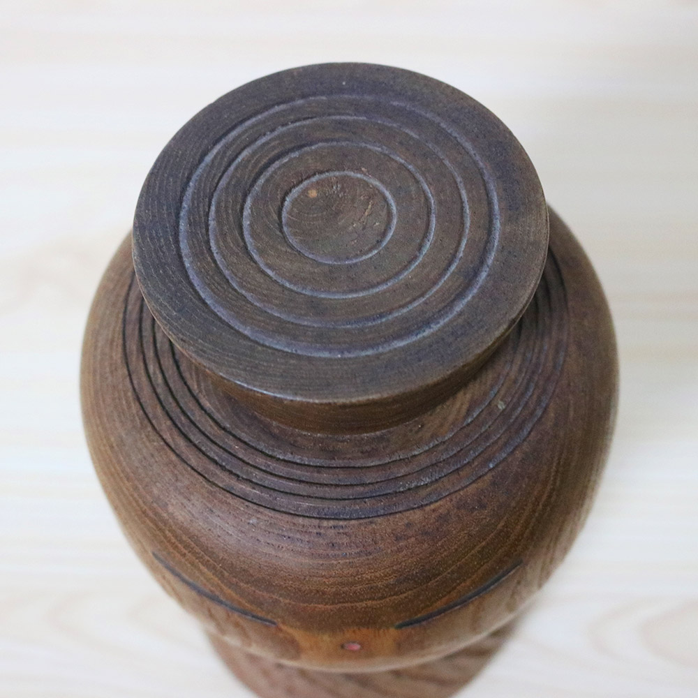 This bulky vintage kokeshi doll features rounded carvings on top of her head as well as a body gently carved with a simple pattern.
