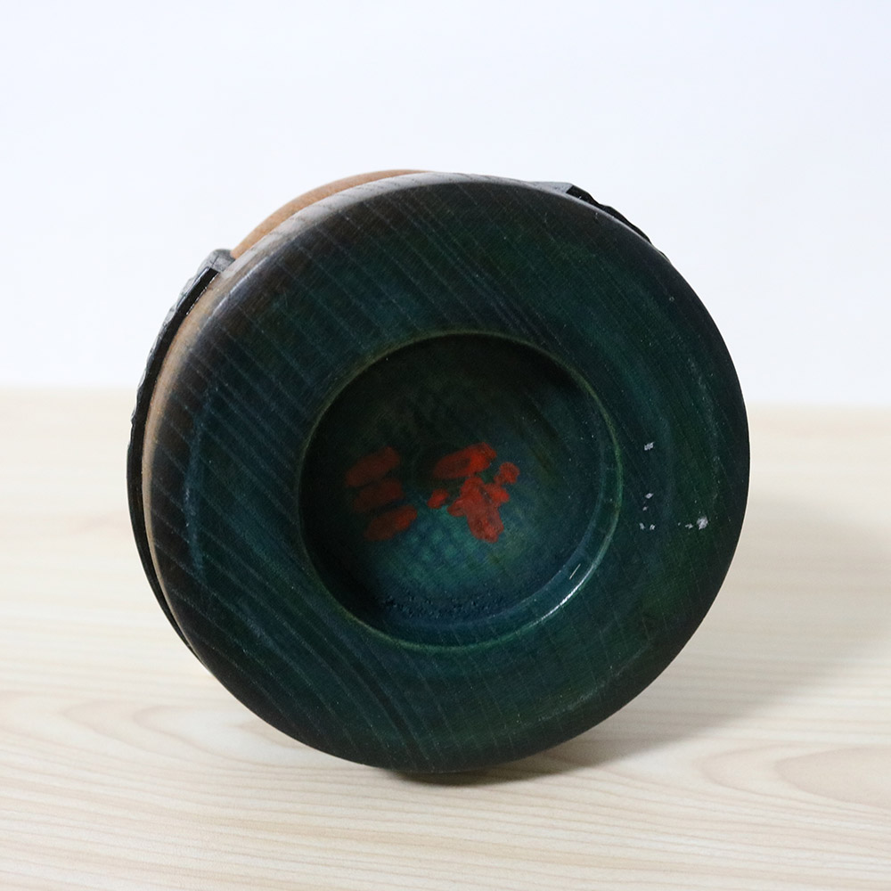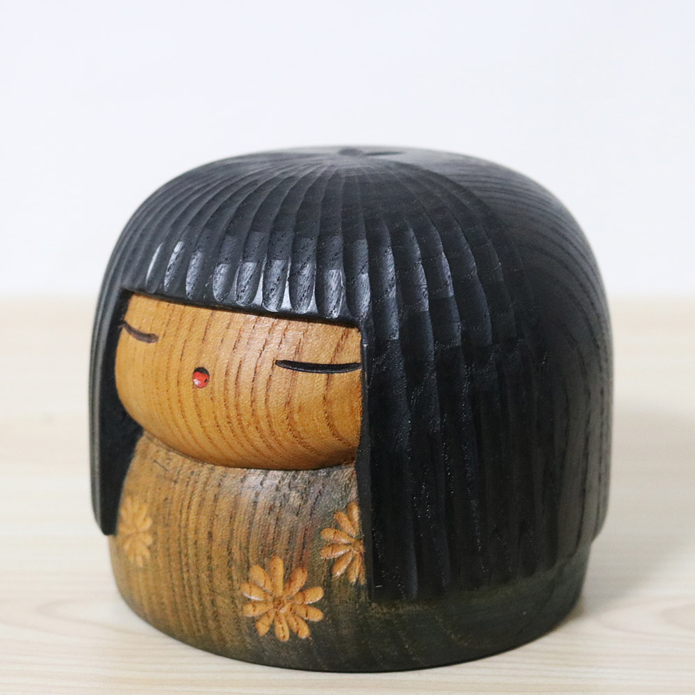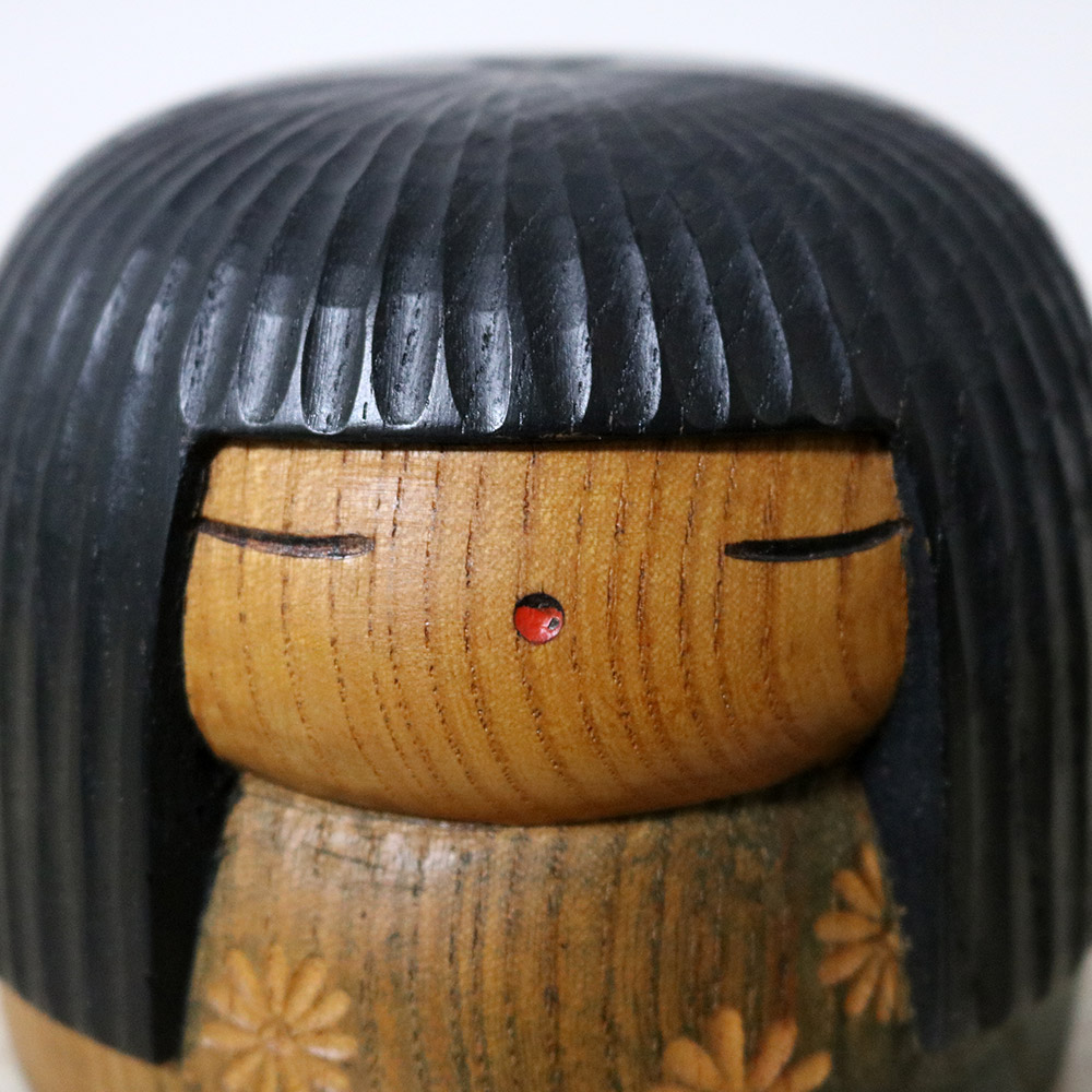 This chubby vintage kokeshi was made and signed by master Yamanaka Sanpei (1926-2012). Her title is 春恋し (Harukoishi) which means “Longing for Spring”. She’s wearing a red kimono with simple flower decorations carved on it. Her hair is beautifully carved in the front.