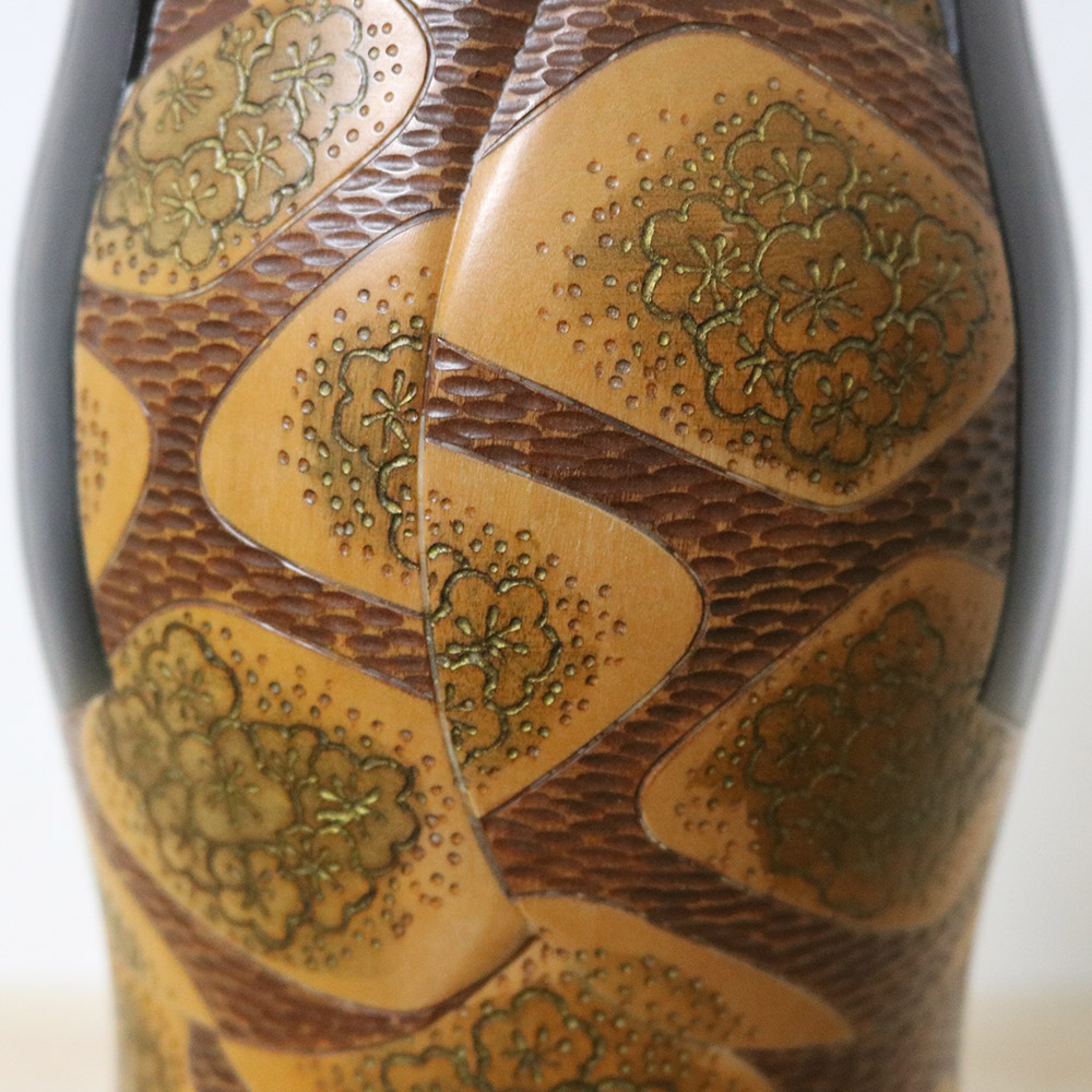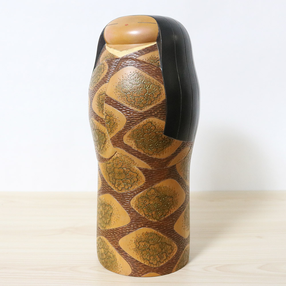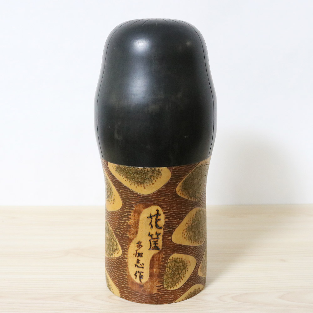 This beautiful vintage creative kokeshi doll was made and signed by Yoshida Takashi. Her title is 花筐 (Hanagatami) which means “Flower Basket”. The expression 花筐 has been used in classical Japanese literature and it can also mean “Beauty and Elegance”. Her meticulously carved kimono is decorated with patches of plum flowers. Plums are considered to be auspicious in Japan since they blossom first after the winter, hence they symbolize perseverance and hope.