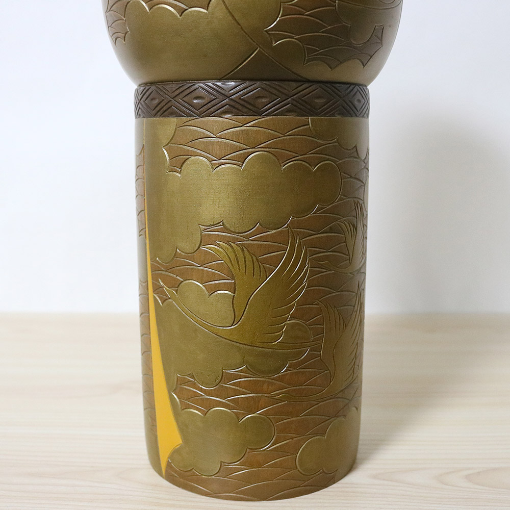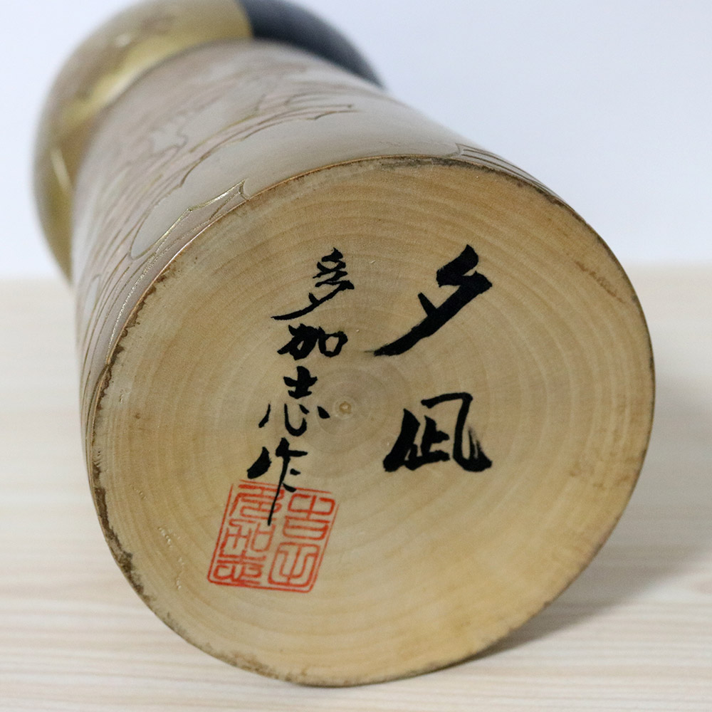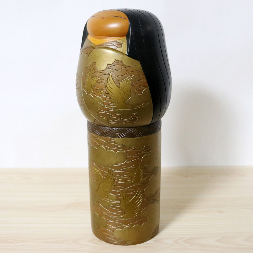 This beautiful vintage creative kokeshi doll was made and signed by Yoshida Takashi. Her title is 夕凪 (Yunagi) which has a very unique meaning – in the coastal areas of Japan, daytime winds often arise from the temperature difference between the land and the sea. Around sunset, these winds weaken (and even stop) creating a quiet, calm and motionless sea. This peaceful moment is called Yunagi. Her stunning kimono is in shades of gold/green and it’s beautifully decorated with birds flying with clouds in the sky and the sea in the background.