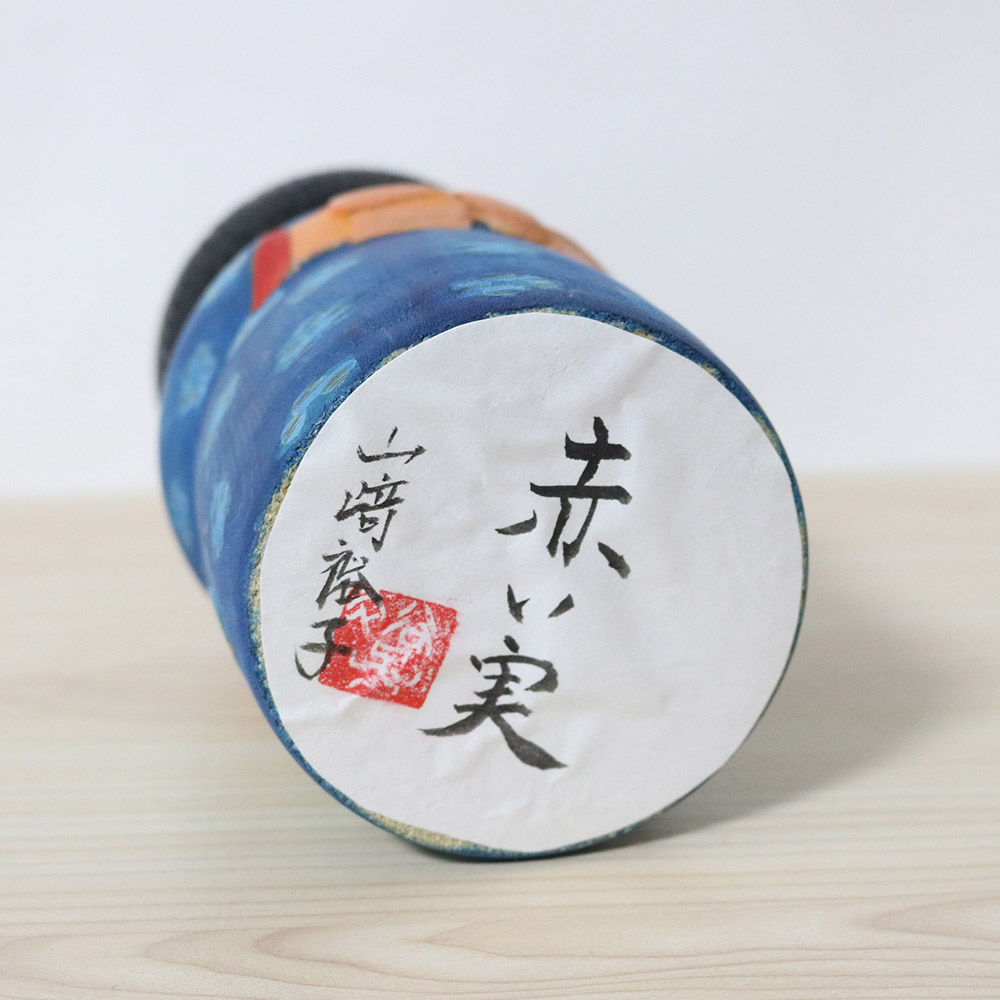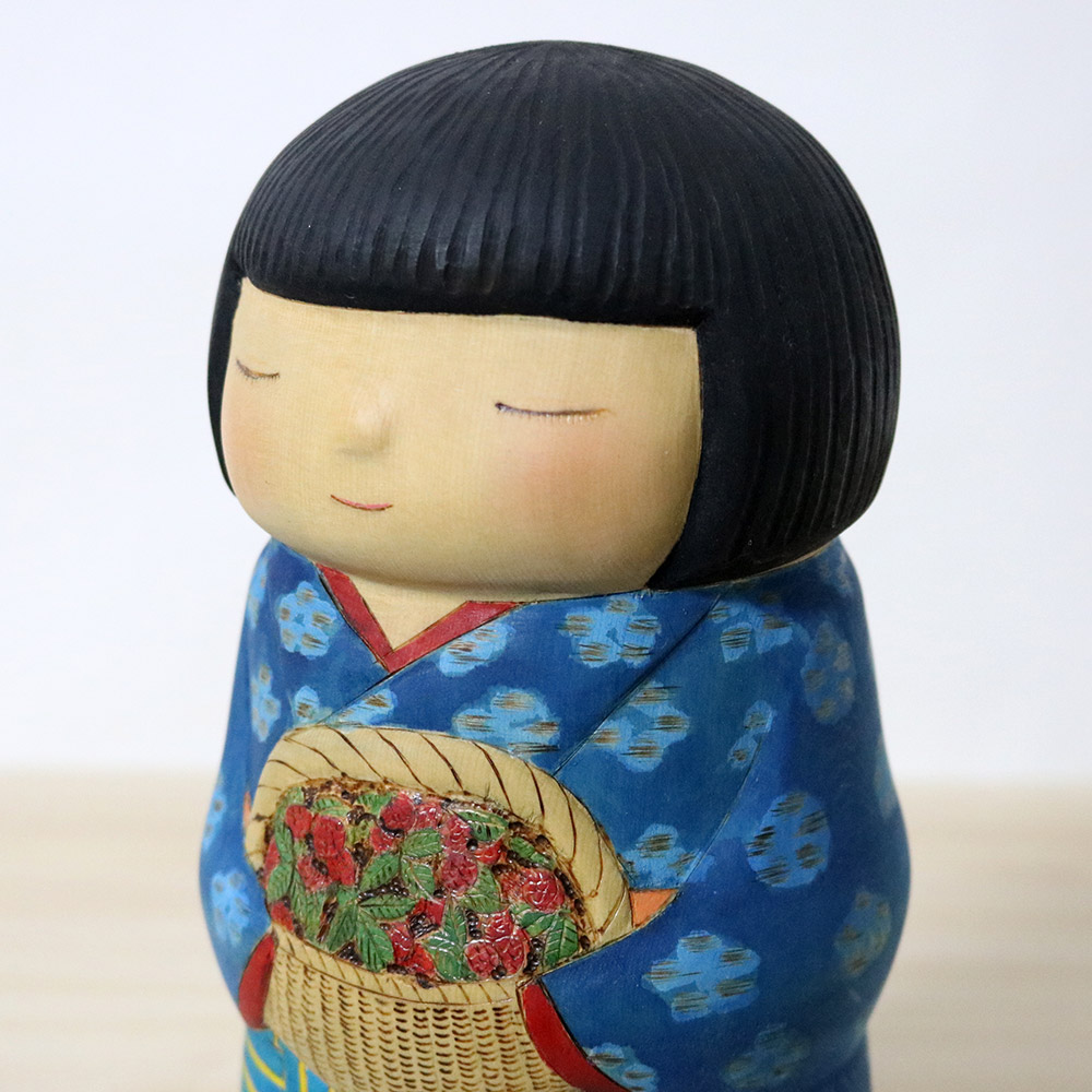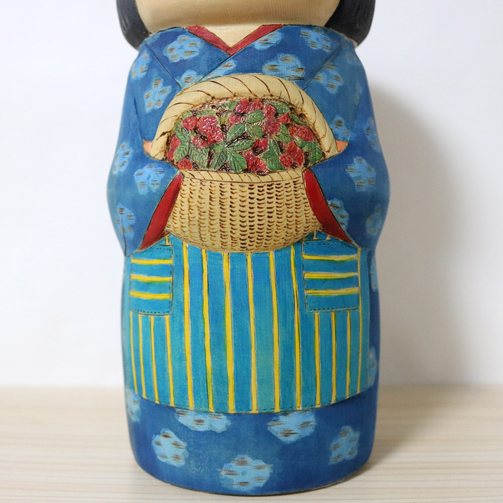 This creative kokeshi doll was made and signed by Yuko Yamazaki (1956-). Her title is 赤い実 (Akaimi) which means any fruit or berry that are red. This beautiful doll is holding a basket full of strawberries. She’s wearing a lovely blue kimono with simple floral decorations and a yellow strip & blue apron.