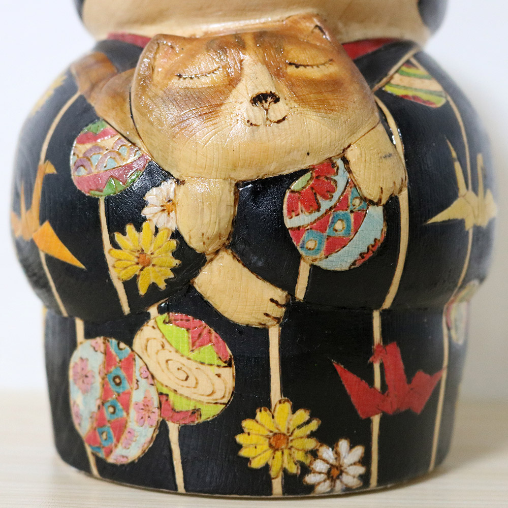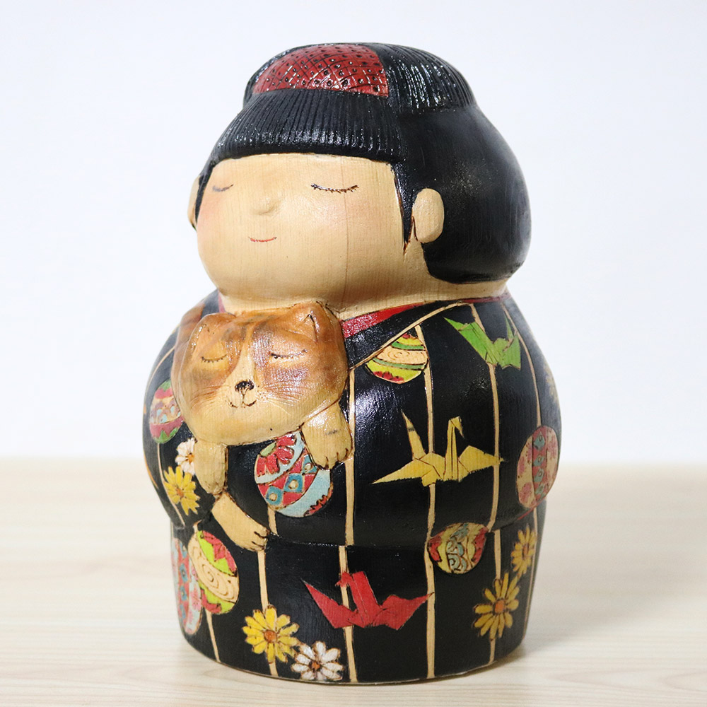Her title is うたたね (Utatane) which means “Dozing Off”. The title refers to calmly and softly falling into a sleep (even while sitting). She’s wearing a black kimono with origami cranes, temari balls and flowers. She’s holding an orange cat comfortably sleeping in her warm arms.